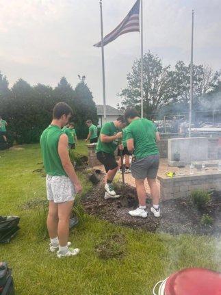 The Providence Catholic Football seniors came together to landscape the Athletic Memorial and trim the bushes around the stadium