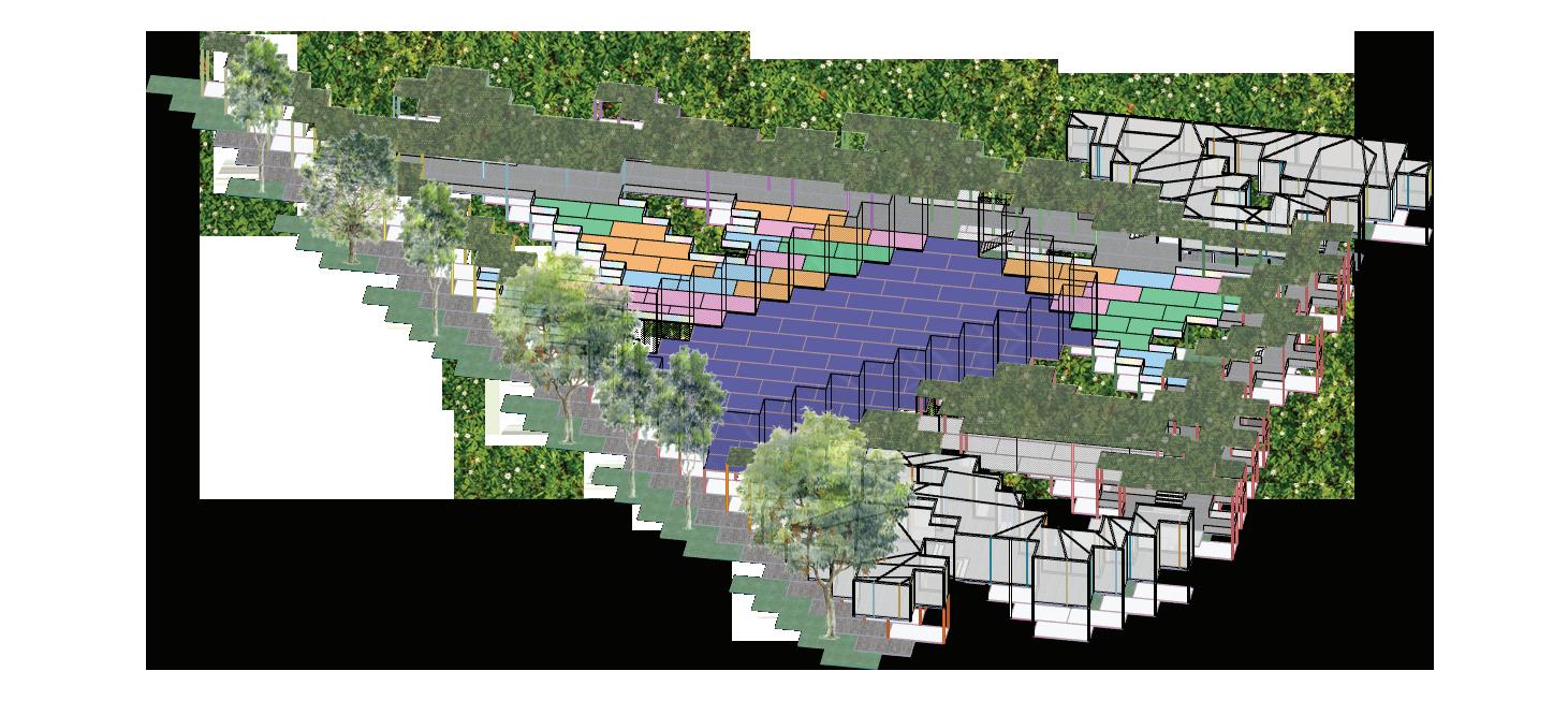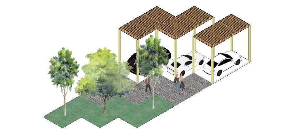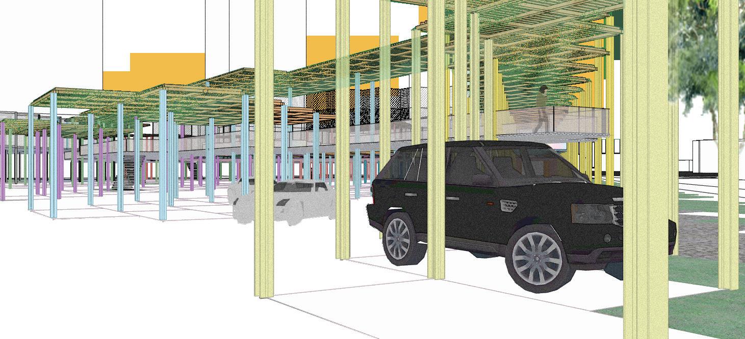 Inserting in blocks of greenery throughout the site and clusters of non-parking spaces on the ground level