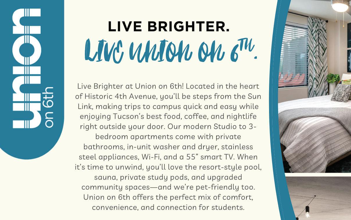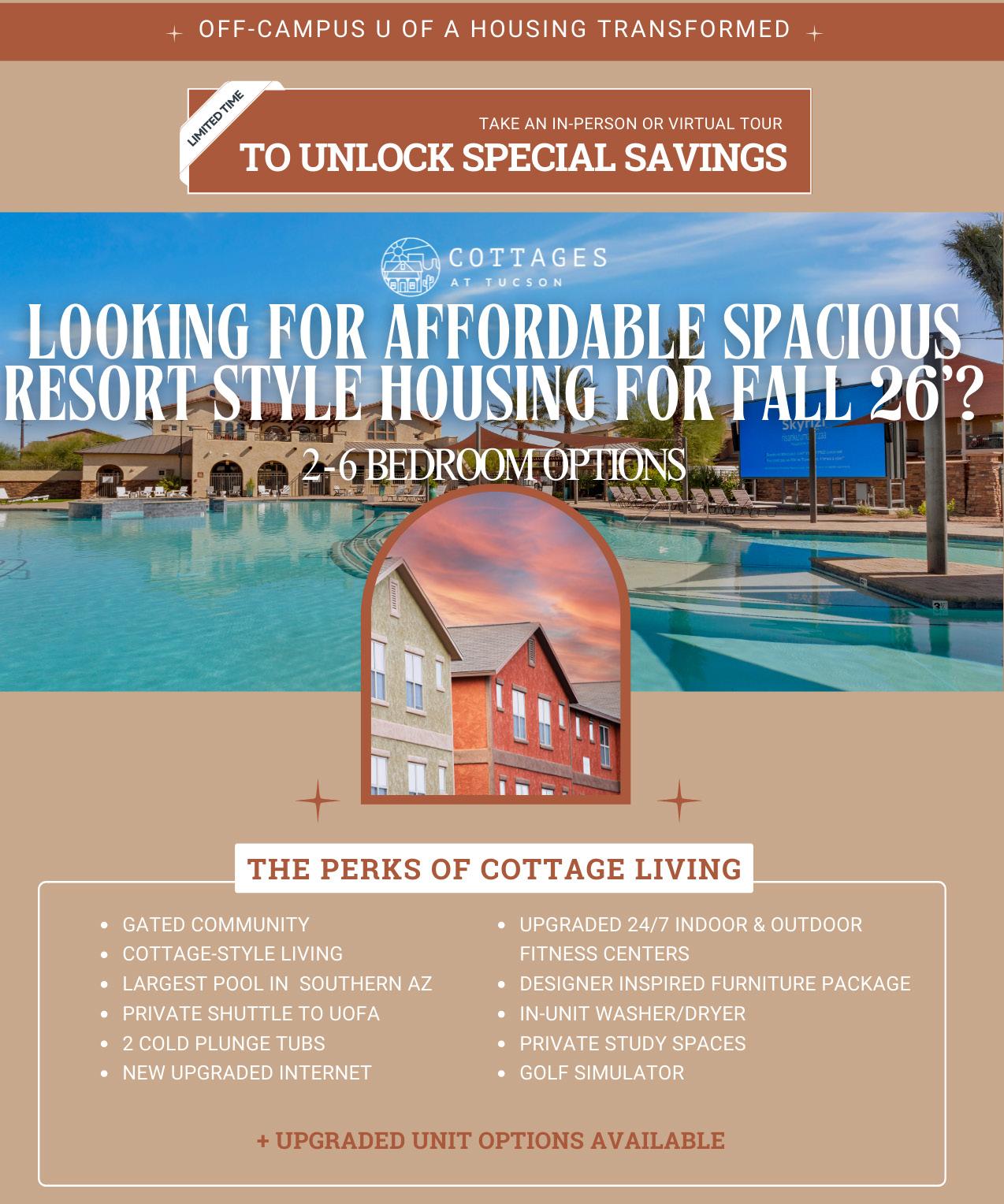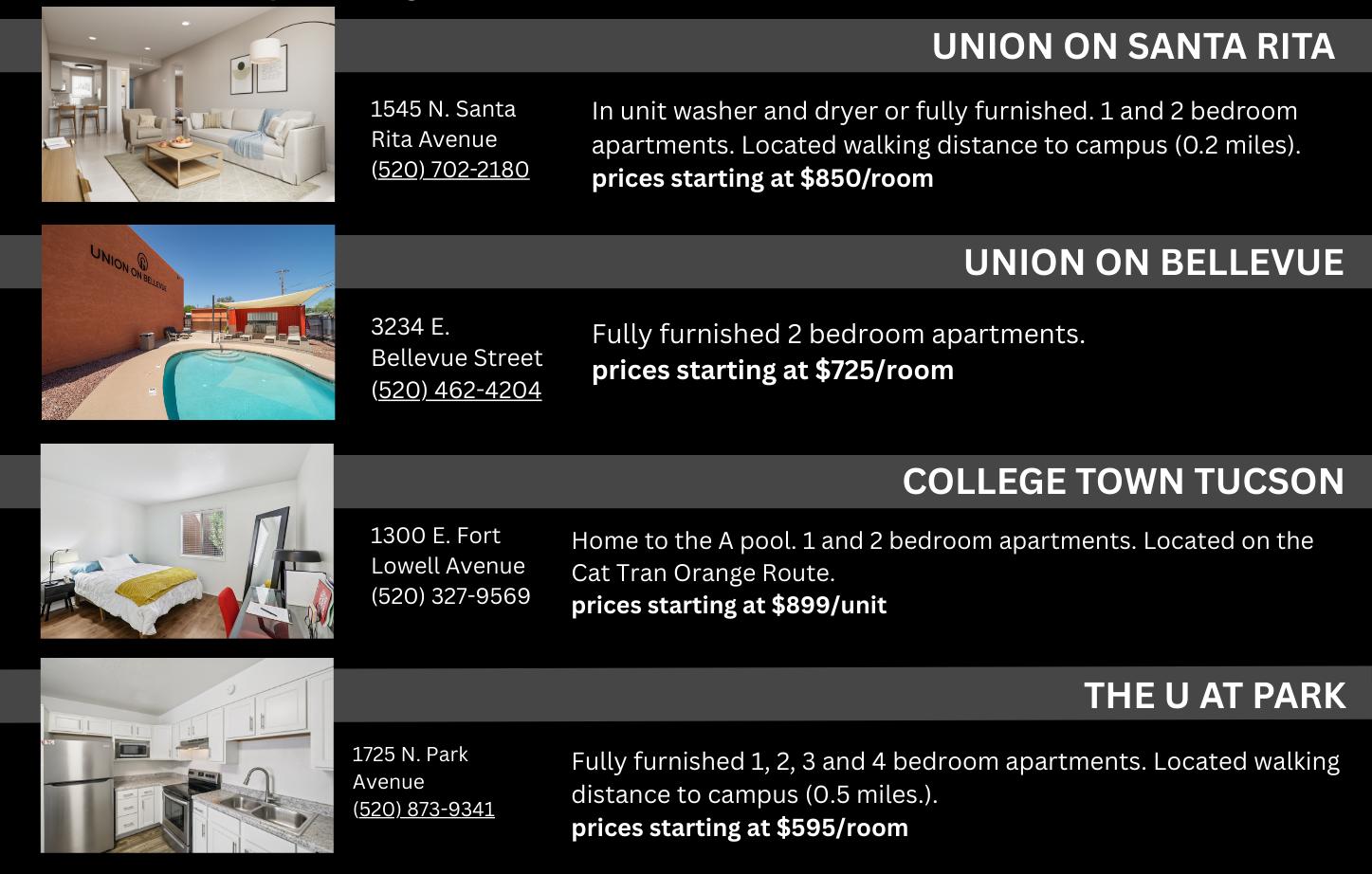 Arizona Student Media hosts the Housing fair twice a year, bringing together apartment complexes from across Tucson to answer all your housing questions. Use this publication as a guide to offcampus housing in Tucson!