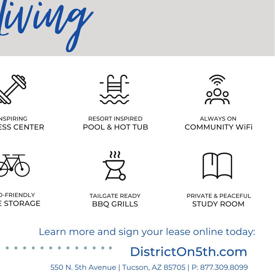 B16 • The Daily Wildcat Housing Guide ● November 2022 FIND WHAT MOVES YOU. HUBONCAMPUS.COM Furnished Studio - 6 Bedroom apartments with a central location and upscale amenities. Life at Hub Tucson Park Ave is unlike anywhere else. NOW LEASING. 1055 N Park Ave. | (520) 829-1788 @HubParkAve