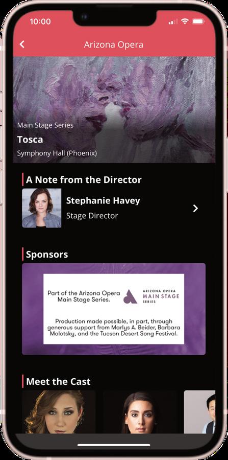 For a complete calendar, scan this code or visit azopera.org/upcoming-events. Stay in the KNOW Download the ARIZONA OPERA APP •Access your tickets digitally •Explore our digital programs •Get updates as instant notifications •Support the opera with one-touch donations DEVELOPED BY OCTOBER 10.11 Coffee @ Kerr: Frankenstein Kerr Cultural Center PHX Frankenstein Student Preview Herberger Theater Center PHX 10.13 RED Party Herberger Theater Center PHX 10.13-10.15 Frankenstein Herberger Theater Center PHX 10.18 Costume Sale Arizona Opera Center PHX 10.20 Opera Outdoors Temple of Music and Art TUC 10.21 RED Party Temple of Music and Art TUC 10.21 & 10.22 Frankenstein Temple of Music and Art TUC 10.25 Opera for Lunch Arizona Opera Center PHX NOVEMBER 11.3-11.5 New Works Festival Arizona Opera Center PHX 11.29 Opera for Lunch Arizona Opera Center PHX JANUARY 1.17 Coffee @ Kerr: The Barber of Seville Kerr Cultural Center PHX 1.24 Opera for Lunch Arizona Opera Center PHX 1.25 The Barber of Seville Student Preview Symphony Hall PHX 1.27 & 28 The Barber of Seville Symphony Hall PHX FEBRUARY 2.2 Opera Outdoors Tucson Botanical Gardens TUC 2.3 & 2.4 The Barber of Seville The Linda Ronstadt Music Hall TUC 2.21 Coffee @ Kerr: Roméo & Juliette Kerr Cultural Center PHX 2.28