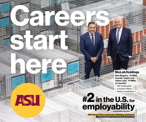 ASU Thrive (USPS 024-438; ISSN 1940-2929) is published quarterly by Arizona State University Enterprise Brand Strategy and Management, 660 S Mill Ave, Centerpoint Suite 401, Tempe, AZ 85281, 480-727-5440. Subscriptions are sent to all ASU alumni. For detailed information about supporting alumni traditions, scholarships and programs, visit alumni.asu.edu/give-back/donate Periodicals postage is paid at Tempe, Arizona, and additional mailing offices. Postmaster: Please send address changes to ASU Thrive, Attention: Circulation, PO Box 875011, Tempe, AZ 85287-5011. Permissions: Portions of this publication may be reprinted with the written permission and proper attribution by contacting the ASU Thrive editor. ASU Th rive can be accessed online at news.asu.edu/thrive-magazine