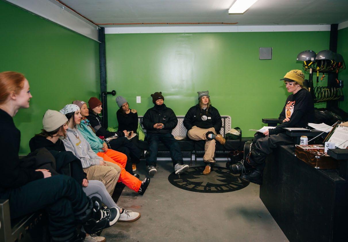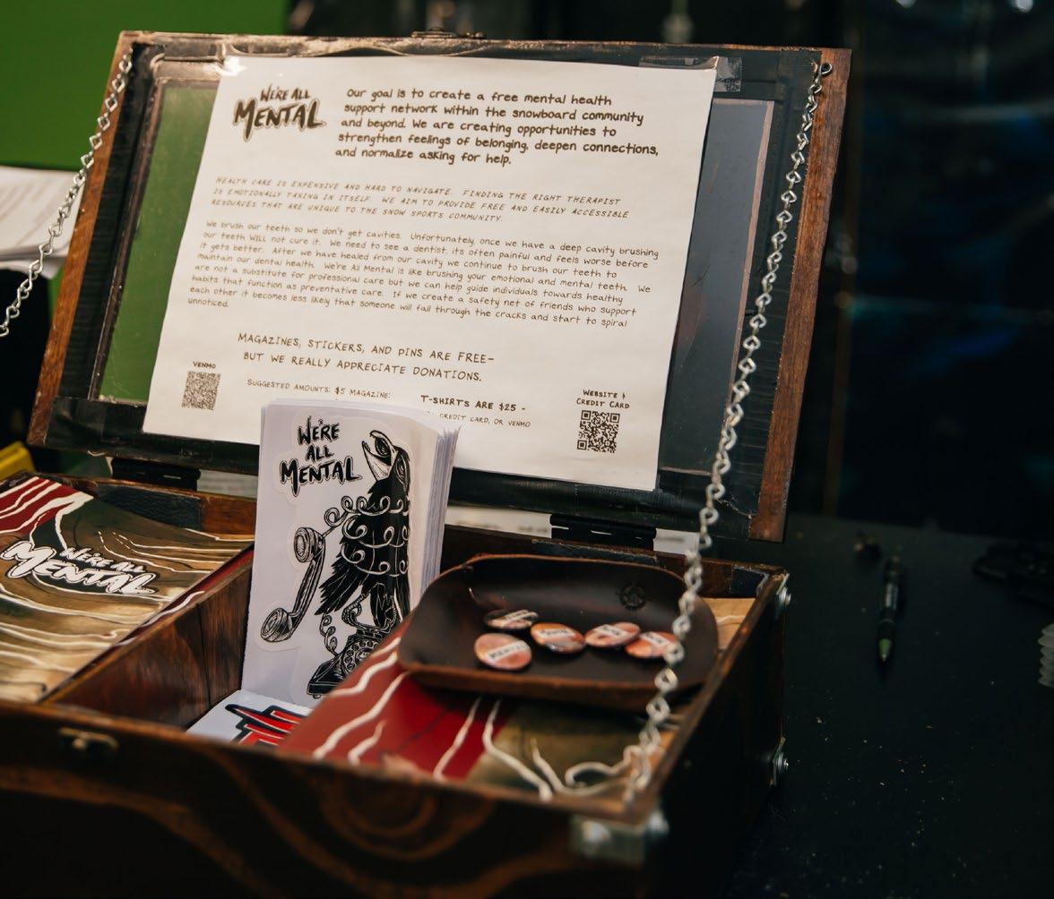In July of 2021, while working through this very scenario, Laura produced a mini-magazine of art, writing exercises, and other materials she found helpful to buoy her emotional wellbeing. Marie Hucal, herself no stranger to the hardships and challenges of professional snowboarding, contacted Laura and offered her a weekly space to chat via Zoom. The weekly meet-up quickly expanded to include other friends within the industry, planting the seeds for what has become We're All Mental. Weekly virtual meet-ups continued, and in July of 2023, a second weekly meet-up was added to the W.A.M. itinerary. To date, more than 125 virtual meet-ups have taken place. Laura also takes advantage of her position as a member of Snowboy Productions' build crew to hold in-person meet-ups around the country at the various stops of the Snowboy Tour.
