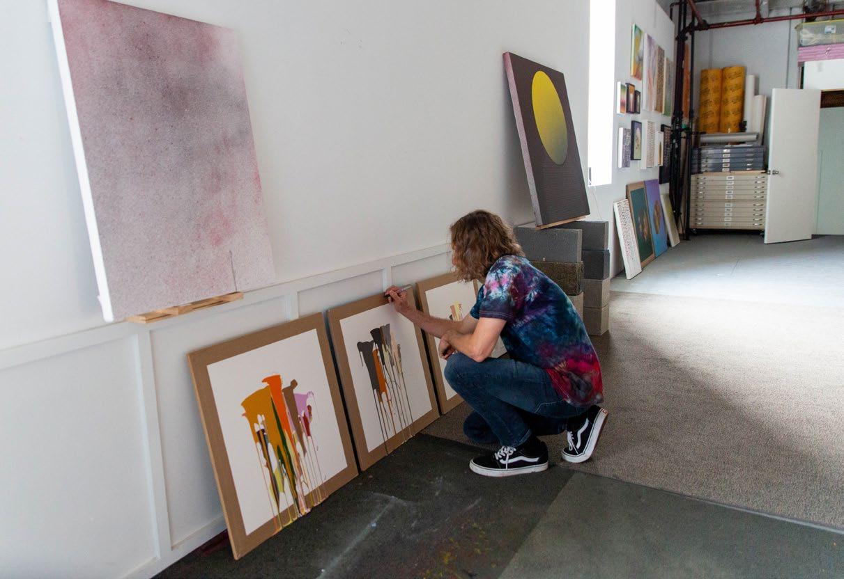 Flashback to the 1980's. It was in this era that artist, musician, and occasional snowboarder Morgan Sims grew up in a blue-collar Sacramento, California home. An environment he considers instrumental in teaching him the value of hard work and an affinity for working with his hands. He also acknowledges his pocket of the West Coast fostered an atmosphere where creativity was viewed positivity and respect. He remembers being attracted to art for as long as he could remember and that his teachers would praise his artwork throughout school. Still, it was only in college that he began considering it in earnest as a career focus. "When I went to college, I didn't know what I wanted to major in necessarily, but it became pretty apparent that I excelled and enjoyed art class. I didn't immediately try to pursue art, but once I did, it seemed like grad school was a good direction to take," he says. Initially focused on printmaking, he expanded his focus to canvas work in graduate school. Sims explains that he enjoys the printmaking process and the individuality of painting, so unsurprisingly, some of his works and methods have evolved into a marriage of the two, process and individuality.