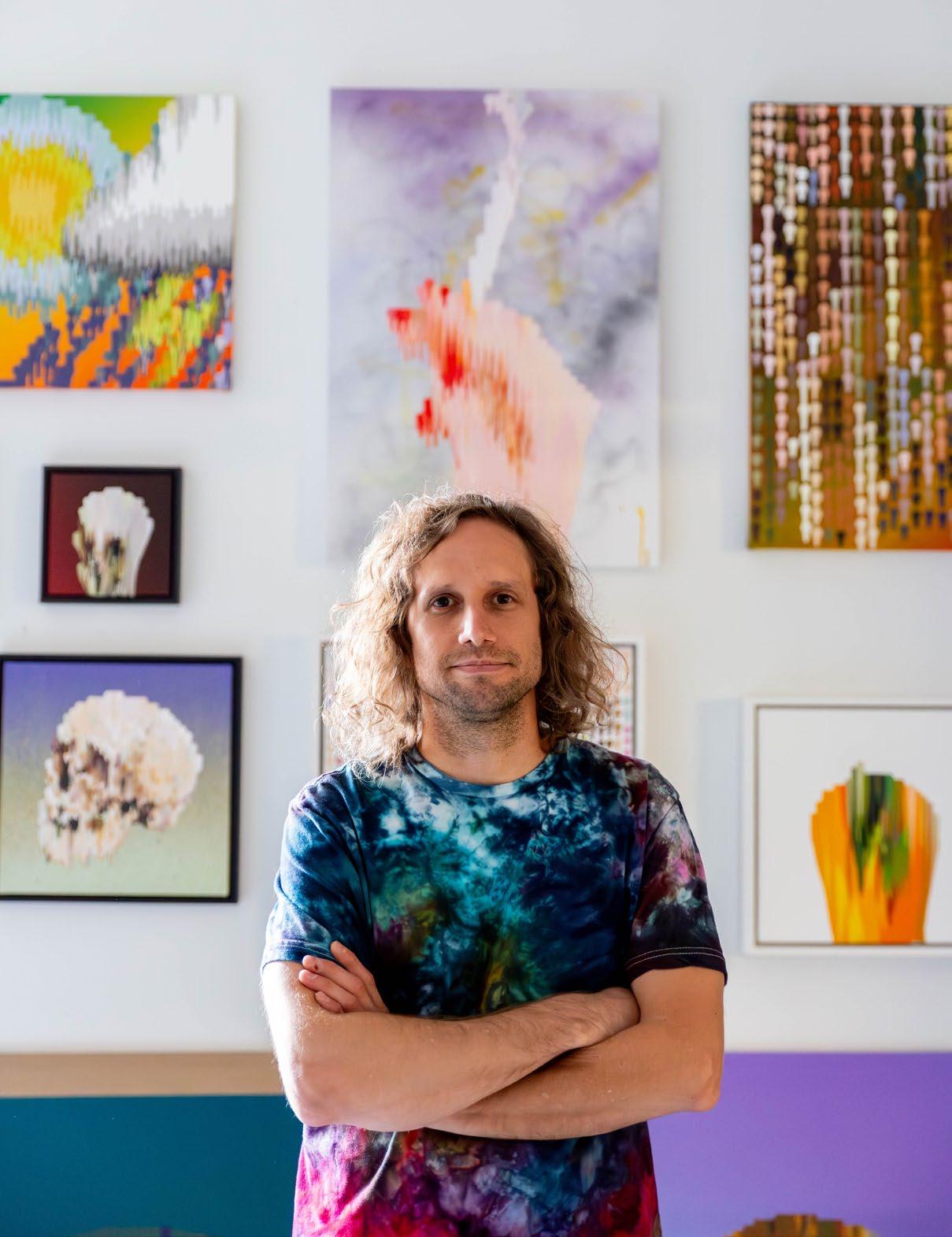 Morgan Sims leans over an enormous blank canvas within his grad student art studio in 2009. He laboriously silkscreens individual squares of color on the large, uncooperative, half-rolled canvas. Frustrated with the process, he chooses to stamp the color with a homemade wood block instead. Tired and sore, he leans the canvas against the wall to alleviate his aching back. His first stamp of the relatively runny ink, intended for use with silkscreen, results in the ink dripping down the canvas. Sims, who admits he has always been drawn towards abstraction, it was an a-ha moment in which he recognized the potential to devise and employ a technique to produce works using purposefully dripped paint.