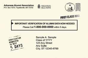 Arkansas, Exclusively for Members of the Arkansas Alumni Association, Inc. (ISSN 1064-8100) (USPS 009-515) is published quarterly by the Arkansas Alumni Association, Inc. at 491 North Razorback Road, Fayetteville, AR 72701. Annual membership dues are now $55 per household and a portion is allocated for a subscription to Arkansas . Single copies are $6. Editing and production are provided through the UA Office of University Relations. Direct inquiries and information to P.O. Box 1070, Fayetteville, AR 72702-1070, phone (479) 575-2801, fax (479) 575-5177.
