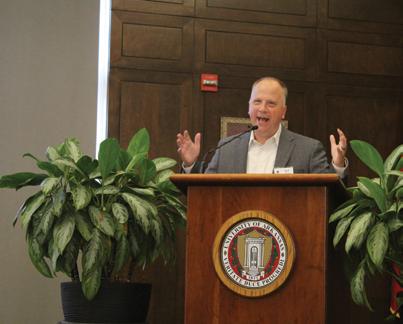 Above, Bordelon speaks to a group of fellow biking enthusiasts at the U of A's "cruise in" event during the spring semester.