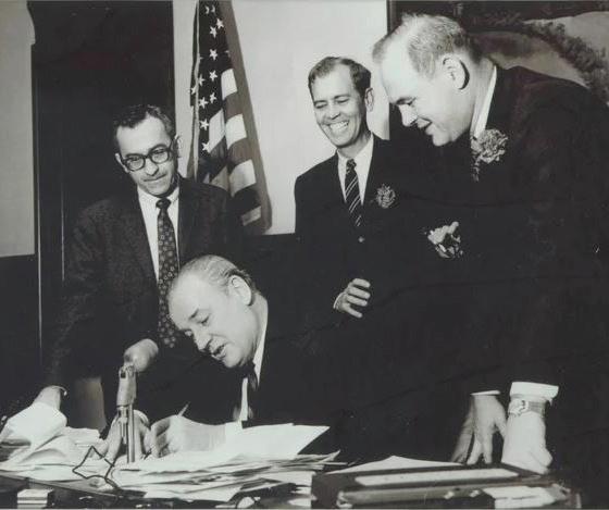 Gov. Winthrop Rockefeller signs the Arkansas Freedom of Information Act into law on February 14, 1967, as Rep. Leon Holsted, Sen. Ben Allen and Bob McCord of the North Little Rock Times look on.