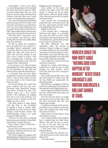 flopping mass over the gunnel. Larry pulled out his pliers and removed the Rogue from the fish’s mouth. “I change out all my hooks with heavier saltwater-grade trebles. They make mincemeat out of a regular freshwater hook.” Larry heaved the 20-somethingpound fish into a horizontal grab and grin for a quick photo and the trophy was slipped back into the water. High fives all around. A few minutes later I connected. Retrieving the Rogue at a painfully slow pace, the strike was like a blind spot sack by a 280-pound lineman. The rod doubled over, and the fish sprinted toward some far-off end zone. The fish’s athleticism was only intensified under the shroud of darkness. I began to shake as I caught occasional glimpses in the moonlight. Adrenaline coursed through my veins. Meanwhile, Larry kept the boat away from stumps and other cover that could have quickly ended the prize fight. “Get wrapped up ‘round wood and that fish is a memory.” Hoping for a photo, and fearing a broken heart, I took my time. I could imagine my dad’s mantra, “Don’t horse him, take your time” echoing in the darkness. The seconds passed like years. And then the moment of truth. Larry slid the big Frabill net underneath the glistening trophy. Still shaking, I struggled to hold up the fish for a quick photo. Then, back into the water she went to fight another day. Bassin’ magazine publisher Brad Uhl was next with another big striper, his first ever at night. Over the next few hours we caught several more fish between jokes and the kind existential talk that only happens late at night. I couldn’t get enough. Each cast into the darkness was another occasion for hope and a freight train crash of fish into metal and wood. Before I knew it, birds began to sing, the prelude to sunrise. As we motored back to Mockingbird Bay, I couldn’t help but think about Marion. She had set me on course for one of the best bites I’d ever experienced—and I was grateful. A few hours later at breakfast I thanked Marion. She beamed like the Cheshire Cat. “You, Brad and Larry had a good time, didn’t you?” “Sure did, ma’am.” Continued on page 42