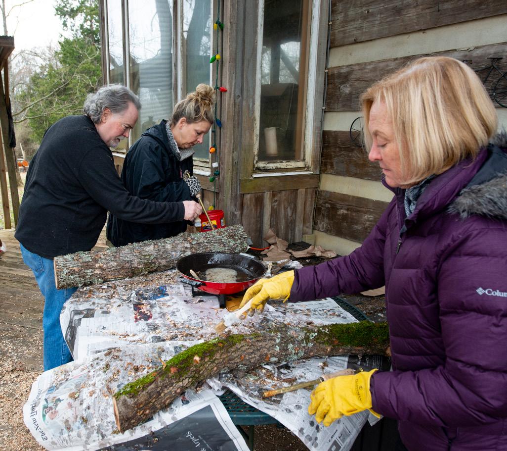 gums for shiitake logs. Oaks will last longer, but sometimes sweet gums are more plentiful and they work fine. I cut live logs only, 3-5 inches in diameter and about 3-4 feet long. This is heavy, rough work. Three winters ago my girlfriend, Suzanne Boscarolo, and our friends Alan and Diana New inoculated over 100 logs using several 5-pound bags of sawdust impregnated with white shiitake mycelium. Using a special collared drill bit and a brass inoculating tool, we drilled about 60 holes in each log, injected the mycelium with the brass inoculator and sealed the hole with hot wax. In four or five months, the mycelium will have colonized the length of the log to the point you might notice white fungus on the log ends. Maybe in late spring but more probably in the fall when the rains come and the temperature changes, you will come out one morning and damn if it isn’t Christmas! If you are lucky and you kept your logs damp during the hot, dry weather and the squirrels didn’t scratch the wax off, you may have 20 or 30 beautiful shiitakes on each log, ready to pick for dinner. It will take three to five years for the shiitake mycelium to turn the log into sawdust and you can expect two or three flushes per year for the life of the log. I buy my spawn and all the needed equipment from Field and Forest Products out of Wisconsin, but there are many other reputable suppliers on the internet.