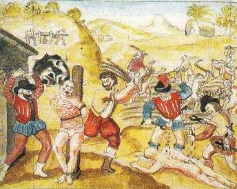 Amputaciones de manos, ejecuciones en la hoguera, empalamientos, ahorcamientos, aperreamientos en los que se lanzaban grandes perros de combate contra personas, abusos sexuales contra mujeres y niñas y masacres fueron algunos de los métodos empleados por los españoles para someter a las poblaciones locales,