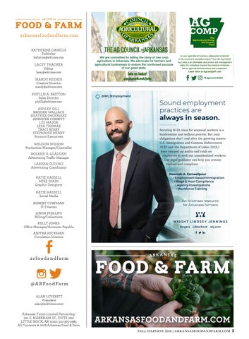 arkansasfoodandfarm.com KATHERINE DANIELS Publisher katherine@arktimes.com LACEY THACKER Editor lacey@arktimes.com MANDY KEENER Creative Director mandy@arktimes.com PHYLLIS A. BRITTON Sales Director phyllis@arktimes.com ASHLEY GILL BROOKE WALLACE HEATHER SHOEMAKE JENNIFER CORBITT LEE MAJOR LESA THOMAS TRACI BERRY STEPHANIE HENRY Account Executives WELDON WILSON Production Manager/Controller ROLAND R. GLADDEN Advertising Traffic Manager LARISSA GUDINO Advertising Coordinator KATIE HASSELL MIKE SPAIN Graphic Designers KATIE HASSELL Social Media ROBERT CURFMAN IT Director