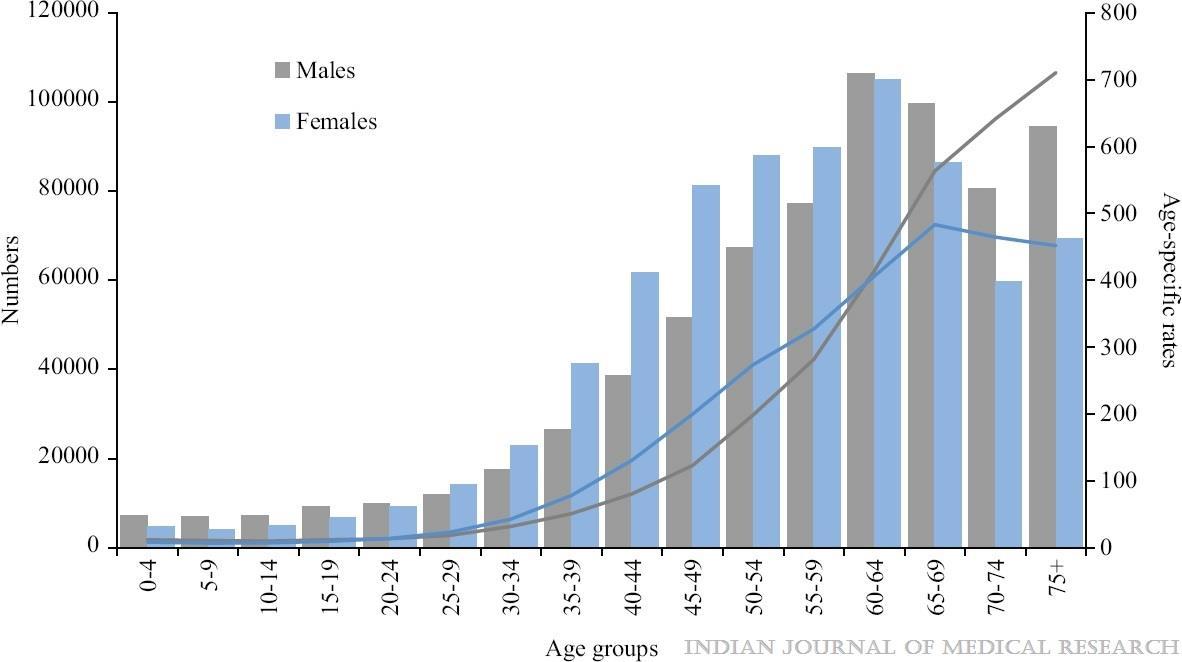 Estimated age-wise number and incidence rate for all sites of cancer by sex – 2022.