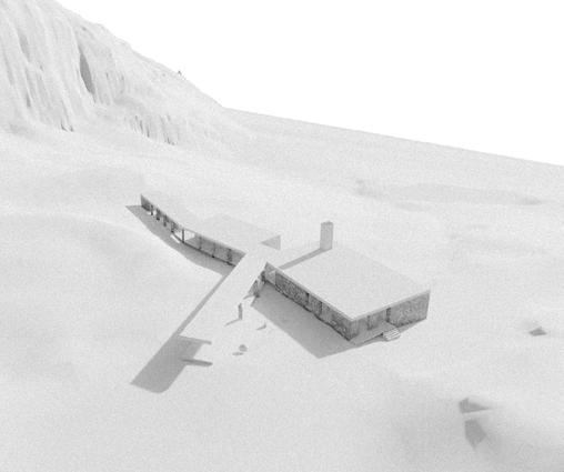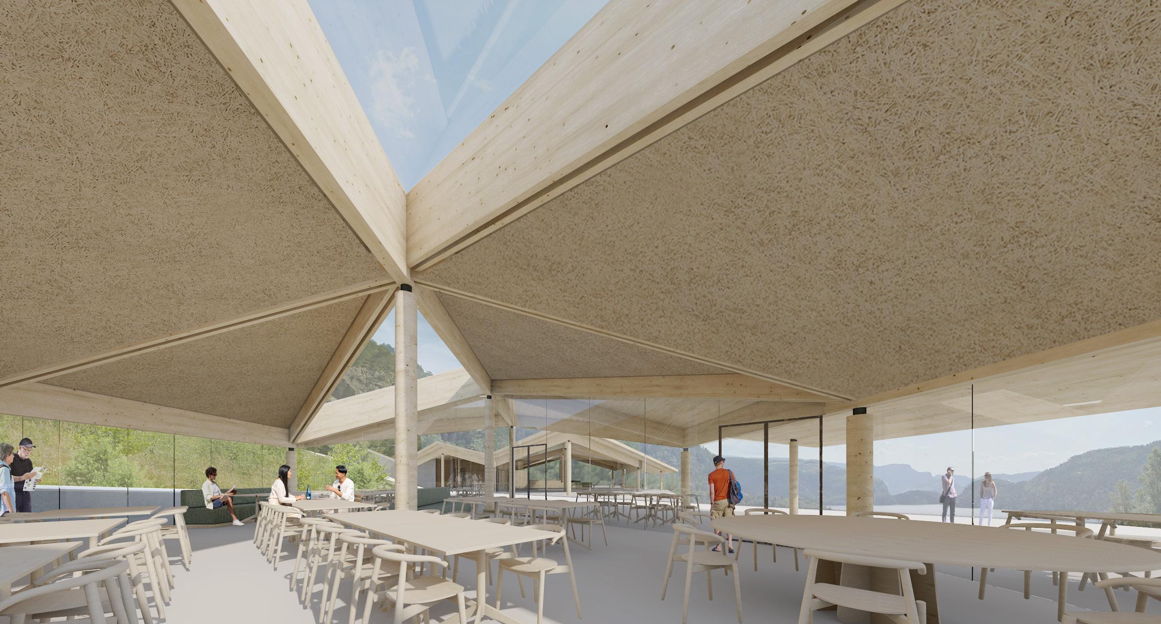 Romlige kvaliteter Prosjektet skaper både innendørs og utendørs rom som kan brukes av besøkende året rundt. Sørvendte flater slipper solen inn, og taket gir ly for det skiftende været. For de som ønsker å trekke seg helt ut av bygningen, formes det uterom langs den skrånende adkomsten, hvor man kan nyte solen uhindret ved bekken og blant de eksisterende bergformasjonene på stedet.