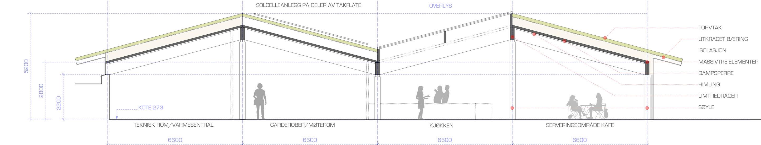 KAFEBYGGETs serveringsareal ligger front av bygningen, med et eget toalettanlegg. Kafebygget inneholder kjøkken med tilhørende fasiliteter for ansatte og andre nødvendige rom for drift. Møterom er plassert ved varelevering Kafebygget.