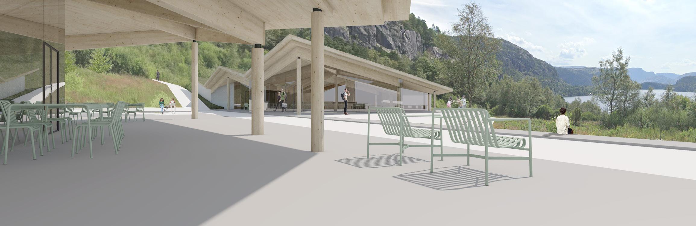 Besøkssenterets utforming, og plassering situasjonen søker å regenerere en opplevelse av et stedlig natur/kulturlandskap tilbake tid. Nybygg er integrert et bygget landskap, langs “veien” til Preikestolen.