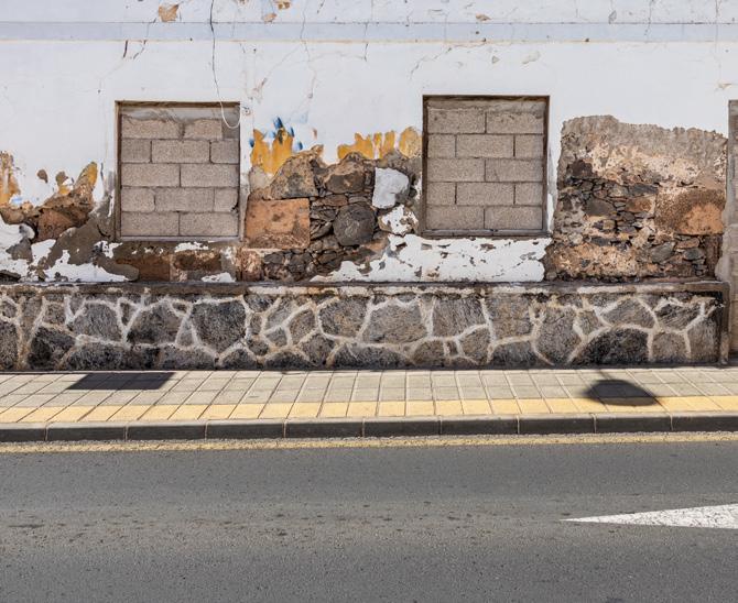 Forfalden facade, hvor tilmurede åbninger, afskallet maling og rå sten fortæller en stille historie om forandring.