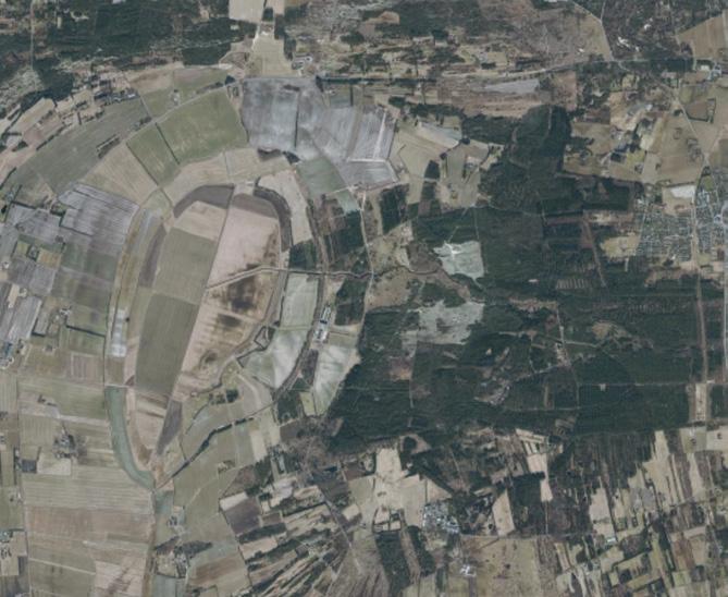 Ortofoto fra 2021 af området ved den tørlagte Gårdbo Sø, Nordjylland. Fotoet viser landskabets og historiens spor – fra tidligere vandstand til menneskeskabte indgreb. Den tørre bund bliver et grafisk kort over fravær og potentiale, hvor nye arkitektoniske spor kan skabes.Foto: SDFE