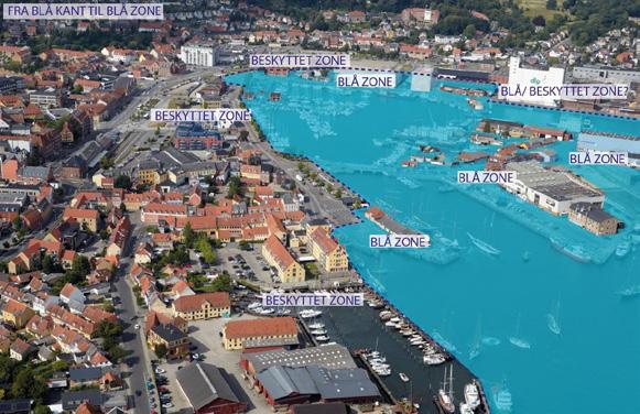Øverst: Den Blå Kant (DBK), oversvømmelse til kote 3 meter, Svendborg Kommune