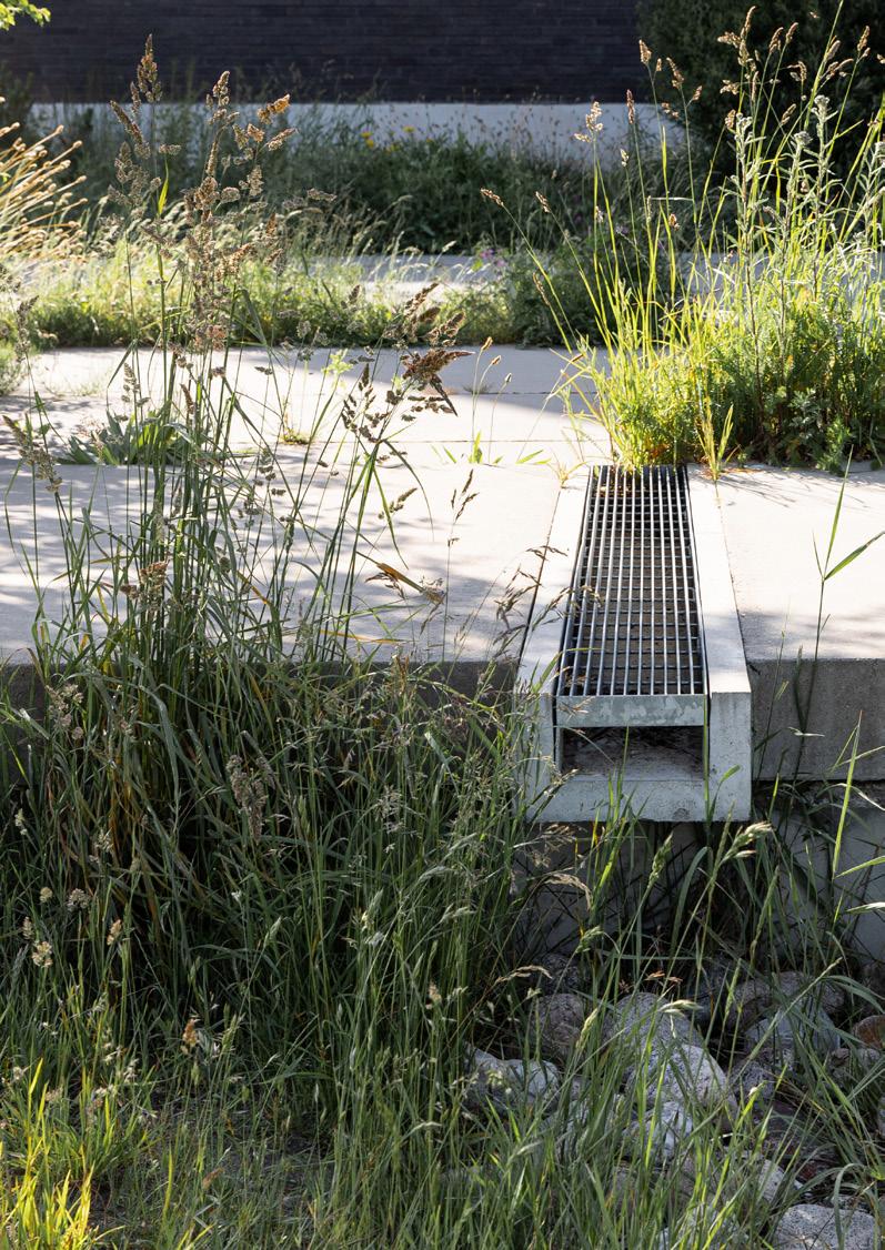 En teglklinkebelagt ’flodseng’ slynger sig mellem de store træer som både sti og vandvej, der leder regnvand gennem området til en ny regnvandssø. Undervejs renses vandet i en såkaldt risleeng, og anlægget kan håndtere op til 15.000 m³ skybrudsvand.