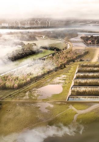 I fremtidsscenariet for Kolindsund tænkes der i formidling af transformationen gennem nye oplevelsespunkter, f.eks. vandsheltere og mosehytter, mens ØHjem integrerer stisystemer, fællesfunktioner og tilgængelighed som en del af både hverdagsliv og turisme. Vandets tilstedeværelse skaber samtidig en ny æstetik i landskabet – ikke som romantisk natur, men som en bevidst tekniknatur, hvor det produktive, rekreative og naturlige smelter sammen i hybride og stedsspecifikke former. I Vestjylland arbejder teamet bag visionen om Skjern Åsystemet med deltaets og åens fysiske, historiske og sanselige potentialer. Vandet bliver her både formgiver, identitetsmarkør, produktiv ressource og en levende medspiller i landskabsdannelsen. Her skabes robuste landskaber, der både kan rumme oversvømmelser, give adgang til naturoplevelser og styrke den lokale tilknytning til vandsystemerne.
