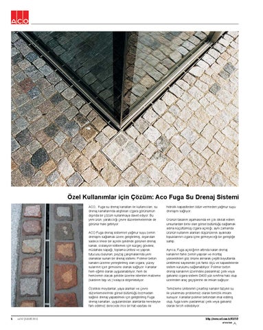 Özel Kullanımlar için Çözüm: Aco Fuga Su Drenaj Sistemi ACO, Fuga su drenaj kanalları ile kullanıcıları, su drenaj kanallarında alıştıkları ızgara görünümün dışında bir çözüm kullanmaya davet ediyor. Bu yeni ürün; yaratıcılığı çevre düzenlemelerinde de görünür hale getiriyor. ACO Fuga drenaj sistemleri yağmur suyu zemin drenajını sağlamak üzere geliştirilmiş, dışarıdan sadece lineer bir açıklık şeklinde görünen drenaj kanalı, izolasyon kilitlemek için süzgeç gövdesi, müdahale kapağı, toplama ünitesi ve yaprak tutucusu bulunan, peyzaj çalışmalarında yeni olanaklar sunan bir drenaj sistemi. Polimer beton kanalın üzerine yerleştirilmiş olan ızgara, yüzey sularının içeri girmesine olanak sağlıyor. Kanallar hem eğimli olarak uygulanabiliyor, hem de hemzemin olacak şekilde üzerine istenilen malzeme (kaldırım taşı vs.) kolayca döşenebiliyor. Özellikle meydanlar, yaya alanları ve çevre düzenlemelerinde görsel bütünlüğü bozmadan sağlıklı drenaj yapabilmek için geliştirilmiş Fuga drenaj kanalları, uygulandıkları alanlarda neredeyse fark edilmez derecede ince bir hat vasıtası ile