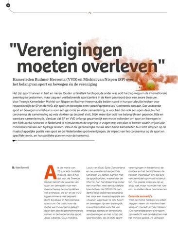Het zijn sportmannen in hart en nieren. De één is fanatiek hardloper, de ander was ooit hard op weg om de internationale zwemtop te bestormen, maar zag een veelbelovende sportcarrière in de kiem gesmoord door een zware blessure. Voor Tweede Kamerleden Michiel van Nispen en Rudmer Heerema, die beiden sport in hun portefeuille hebben voor respectievelijk de SP en de VVD, zijn sport en bewegen even vanzelfsprekend als ’s ochtends opstaan. Dat voldoende sport en bewegen onmisbaar is voor een gezonde en vitale samenleving, is voor hen dan ook een open deur. Nu het coronavirus de samenleving op vele vlakken op de proef stelt, blijkt meer dan ooit hoe belangrijk een gezonde, fitte en weerbare samenleving is. Vandaar dat SP en VVD onlangs gezamenlijk een motie indienden om sport en bewegen in een flink aantal sectoren in Nederland te stimuleren en de regering te vragen met een plan te komen waarin vrijwel alle ministeries hieraan een bijdrage leveren. Vanuit die gezamenlijke missie laten beide Kamerleden hun licht schijnen op de maatschappelijke positie van sport en de Nederlandse sportverenigingen, de impact van het coronavirus op de sport en specifiek tennis, en hun politieke plannen voor de toekomst.