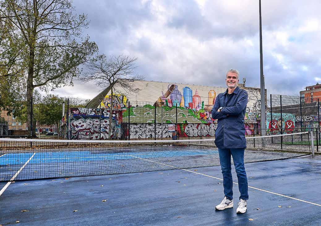 geval van tennis en padel dus ook voor alle verenigingen en centra, zou wat hem betreft de vraag moeten zijn: Wat kun je meer doen dan alleen voor jouw sport? Daarbij erkent hij ook dat juist de tennissport best voor een uitdaging staat. De ‘velden’ zelf, de tennis- en padelbanen dus, zijn lastig zomaar in te zetten voor andere doeleinden. “Bij het gemiddelde hockey-, voetbal- of korfbalveld is dat makkelijker, daar kun je met een beetje goede wil ook een dansvloer in zien. Met een tennisbaan is dat lastiger. Veel tennisparken liggen echter wel weer in een mooie omgeving, ook vaak met enig groen. Daar, in de ruimte om de banen heen en misschien ook wel tussen de banen in, liggen wel mogelijkheden. En dat hoeft lang niet altijd te gaan om integratie van andere sporten. Denk bijvoorbeeld ook eens aan energieopwek-
