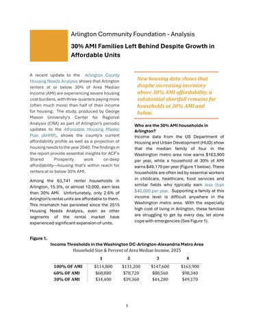A recent update to the Arlington County Housing Needs Analysis shows that Arlington renters at or below 30% of Area Median Income (AMI) are experiencing severe housing costburdens, with three-quarters payingmore (often much more) than half of their income for housing. The study, produced by George Mason University’s Center for Regional Analysis (CRA) as part of Arlington’s periodic updates to the Affordable Housing Master Plan (AHMP), shows the county’s current affordability profile as well as a projection of housingneedstothe year 2040. Thefindingsin the report provide essential insights for ACF’s Shared Prosperity work on deep affordability housing that’s within reach for renters at or below 30% AMI.