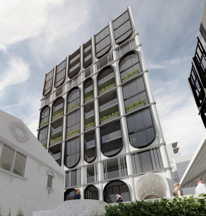 Grattan is a seven storey mixed-use proposal that incorporates 84 apartments, retail and hospitality space that opens onto the corner laneway, and commercial tenancies on the corner side of level one. The slanted form of the facade conforms to meet the Grattan Garden shadow setback requirements and is segmented into three fissures. Breaking down the visual appearance into a rhythm of angler profiles following the language of the garden setback, whilst a green tiled finish looks to blend back towards the Grattan Gardens.