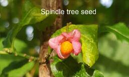 With the loss o f so many magnif icent Elm trees to Du tch Elm disease in the village ACORN took the oppor tunity to plant a Wych Elm, one o f the truly native species o f the UK ACORN has planted many oaks (obviously it’s in the name) around the village and the children o f Go thic Mede and Etonbur y helped with this task. Can any o f you readers remember helping planting one at your schools? Many o ther o f the smaller tree species are planted in hedges and are kept hedge size by regular trimming. The spindle tree being one variety, the young shoo ts have square stems and bear ver y glamorous seed heads. One species to look ou t for in the hedgero w at the Glebe Meado ws.