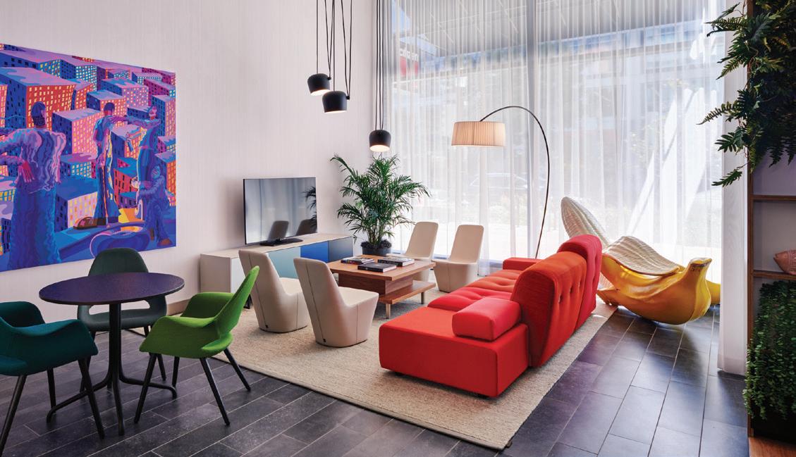 The colorful lobby at the CitizenM Washington DC NoMa hotel