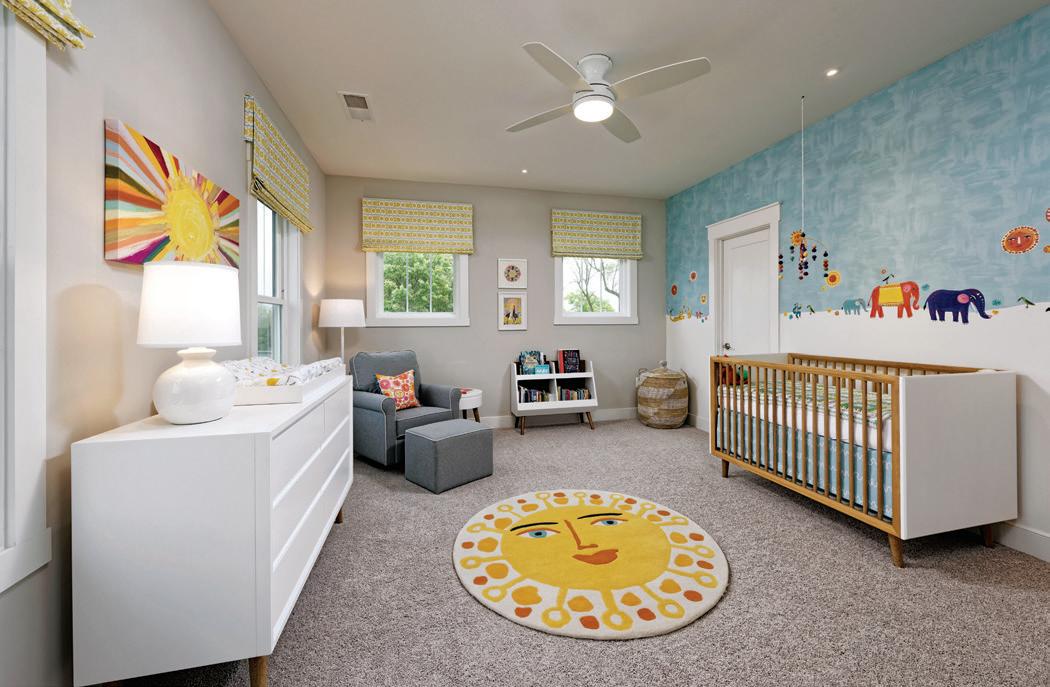 A whimsical baby nursery incorporates prints inspired by children’s storybooks.