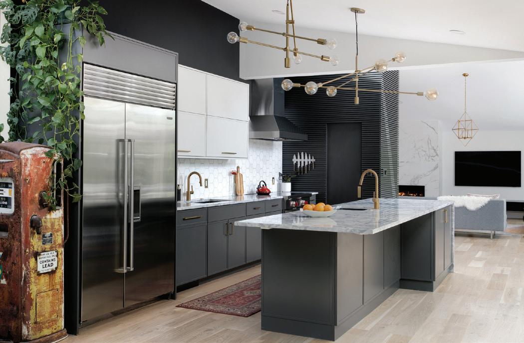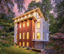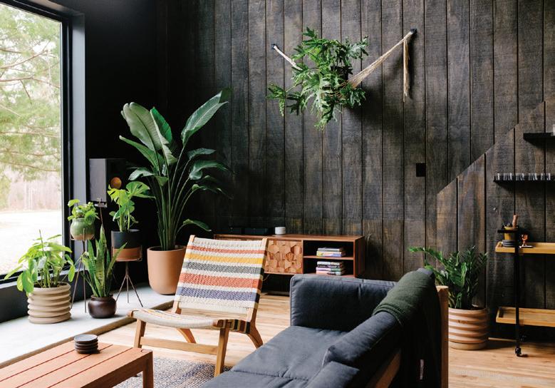 Cozy Elements: While the threebedroom, two-bath home was once a rundown cabin, its redesign and furnishings are Scandinavian moder n, including forest colors of green and dark grays. Most of the space was created with reclaimed and local materials. Blankets hang from living room pegs. Indoor plants as well as Courtney’s “plant hammock” (a regular ham-