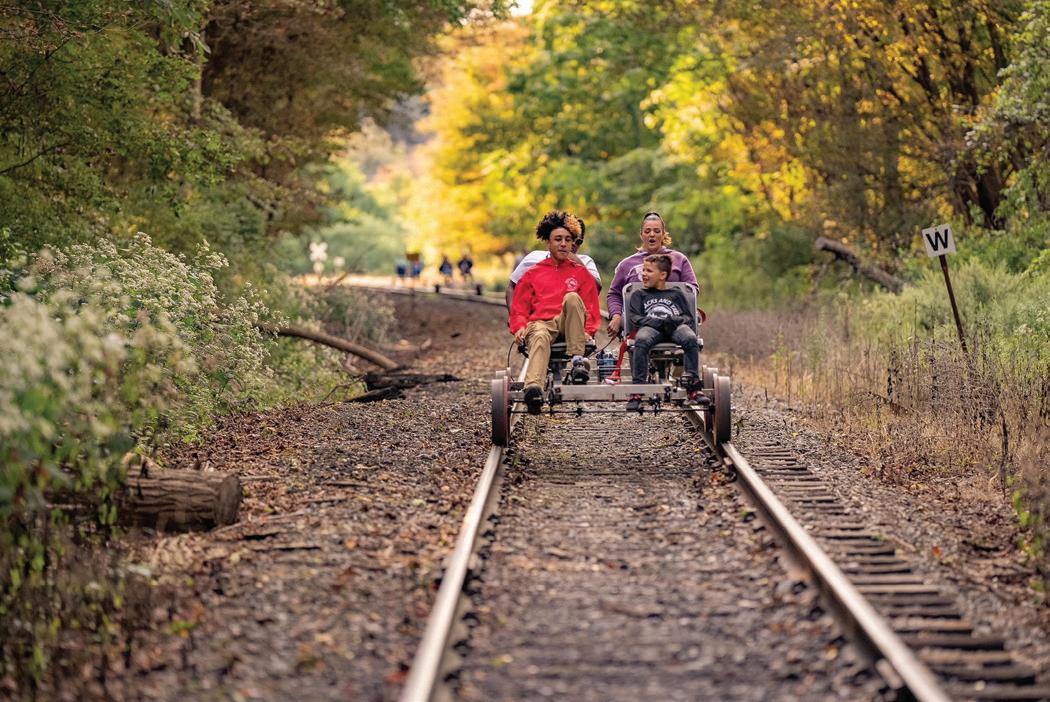 The rides, which are all guided, are leisurely paced and the bikes are easy to handle, making the tours accessible for people of all ages. A variety of tours are available, including the popular Helmstetter Hotshot, a 10-mile, two-hour pedal through the most scenic part of the railway, with a shuttle bus return (from $99 for a tandem bike). Or try the Track and Yak Express, a threehour tour that pairs a 10-mile rail bike ride with a 3-mile kayak or tube float on the North Branch of the Potomac River (from $139).