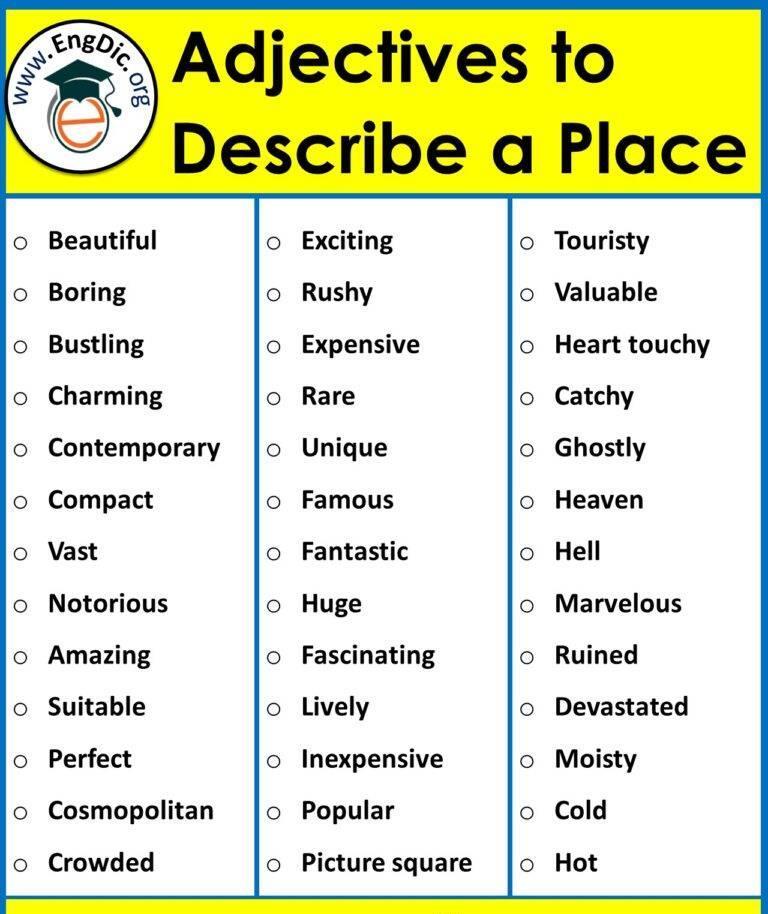 Describing a place with adjectives allows us to convey in a precise and detailed way the characteristics and qualities of that place. Adjectives help us create a mental image in the reader or interlocutor, allowing them to imagine what that place is like without needing to be physically there.