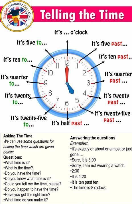 We learned the correct way to tell time, the correct way to ask and answer. as in spanish, in english, the time is expressed according to the hands of the clock. to do this, we must divide the clock into two halves. from the hour on the hour to the included half hour the particle paste is used, except for the hour on the hour when only the word o'clock is used.