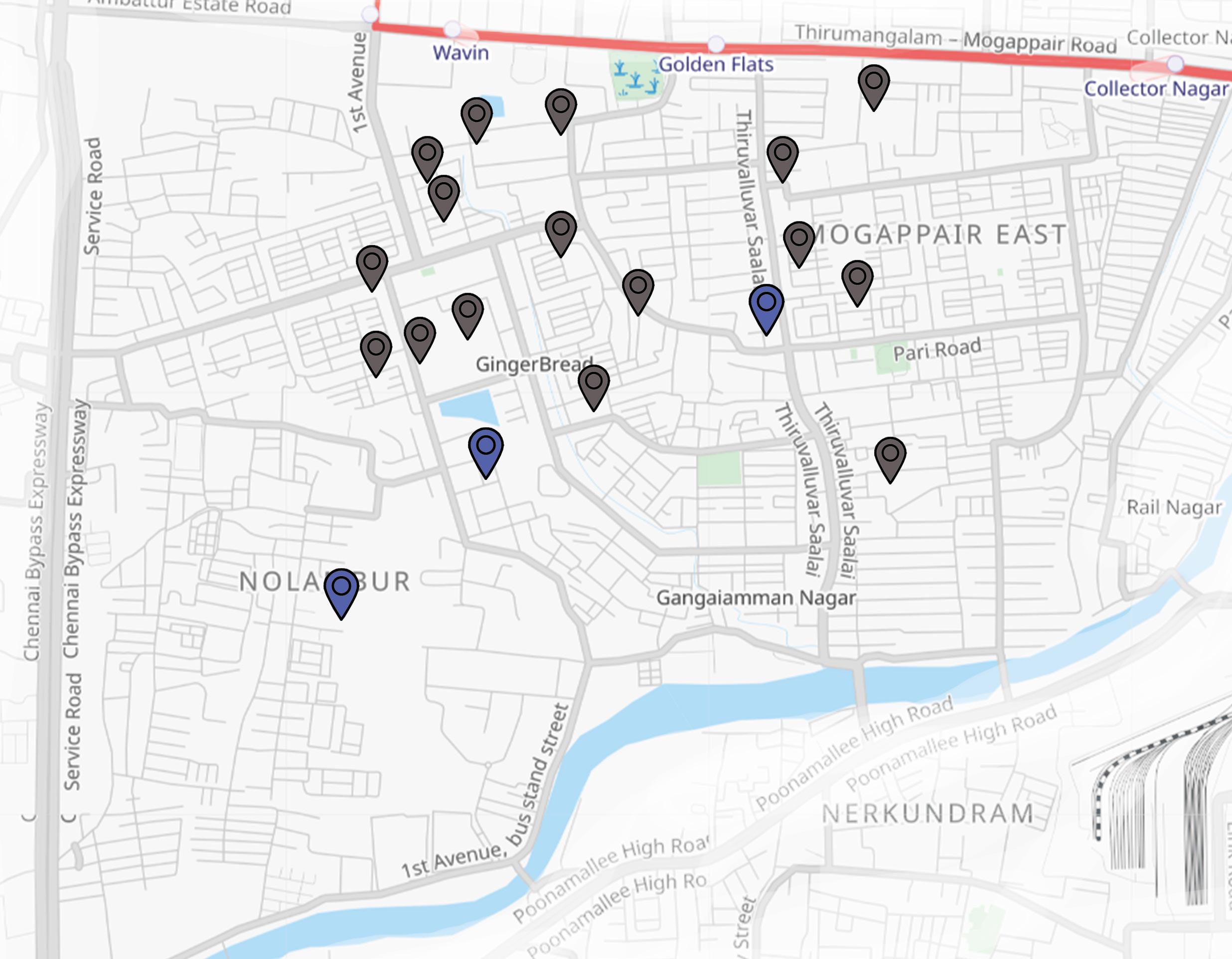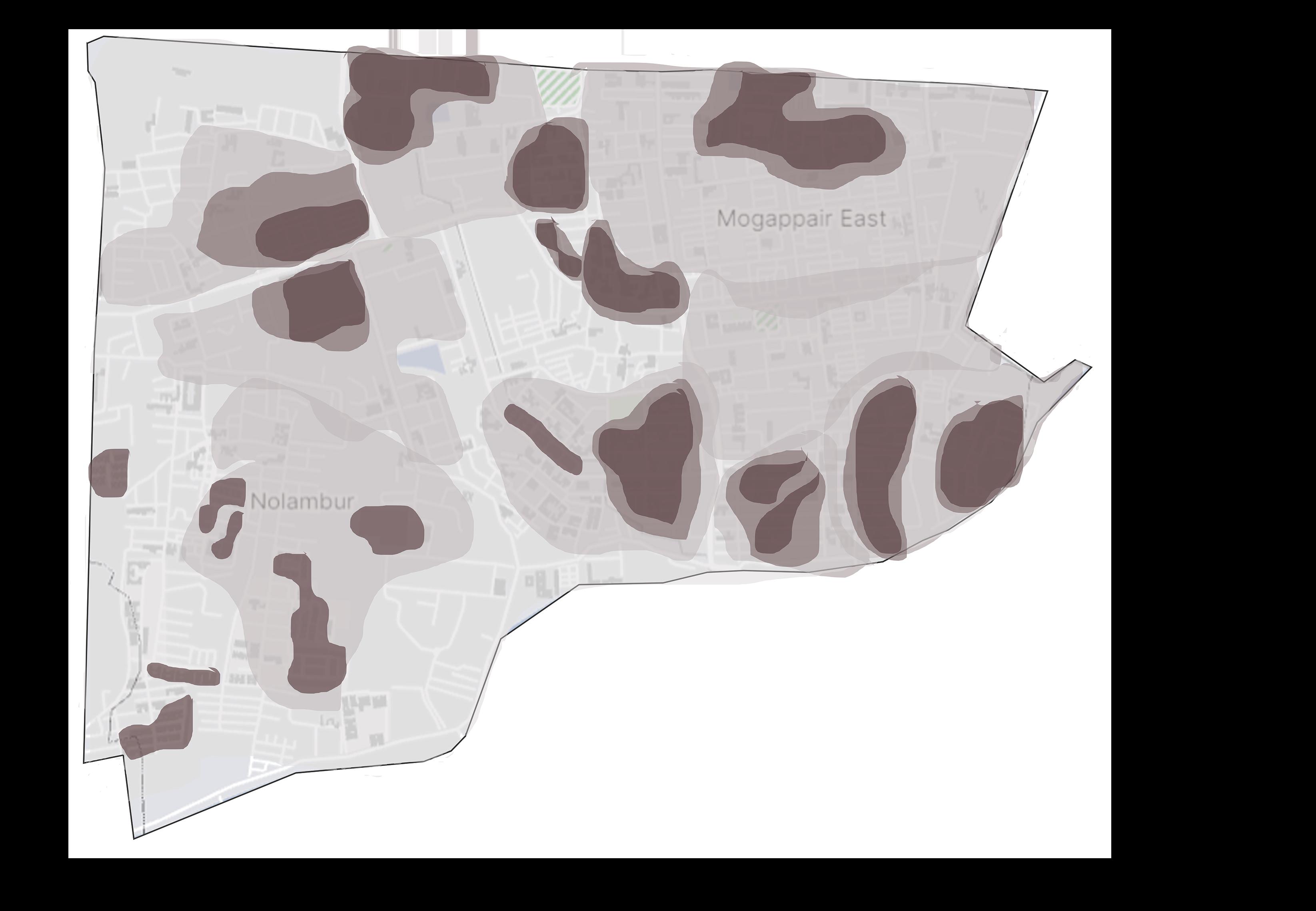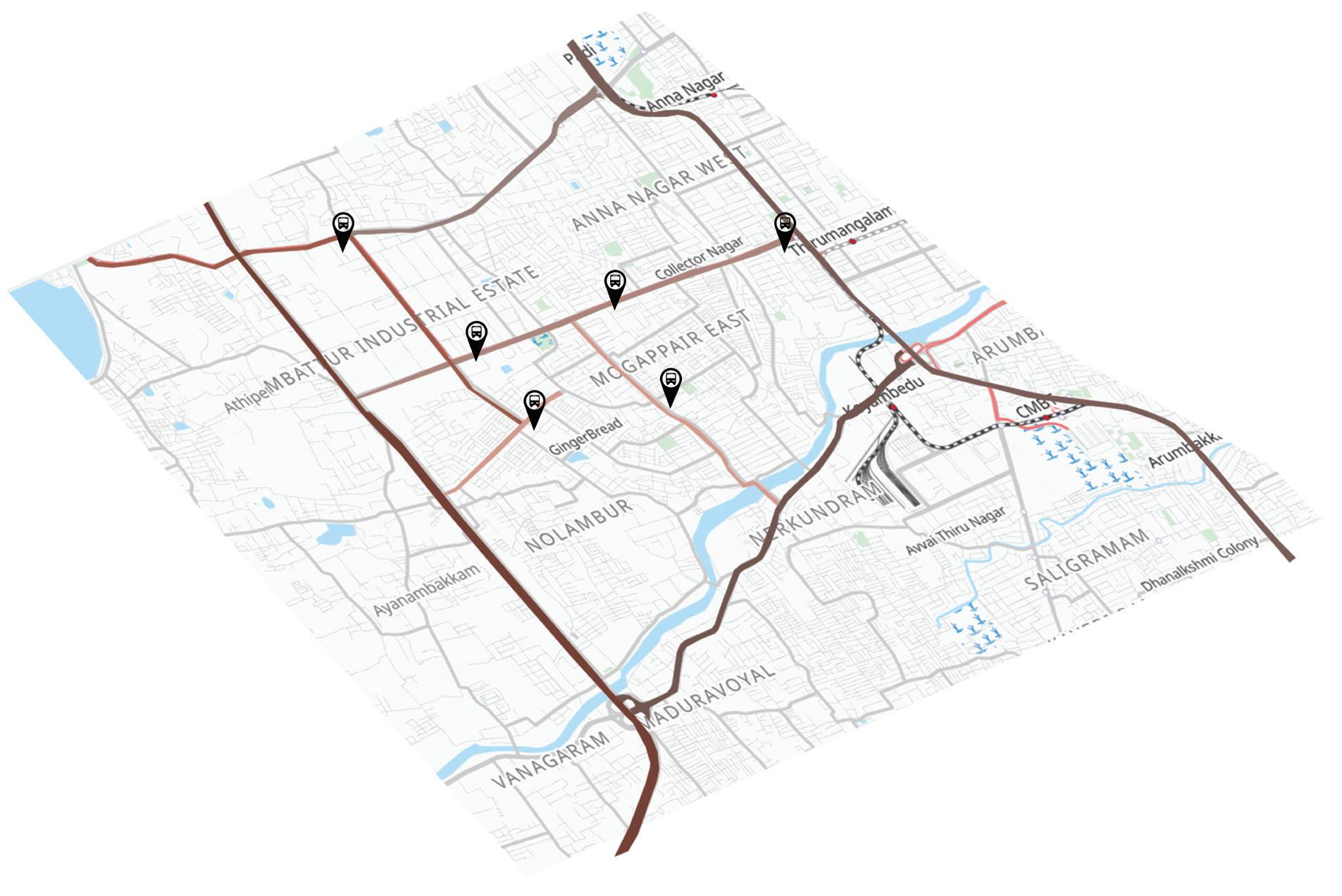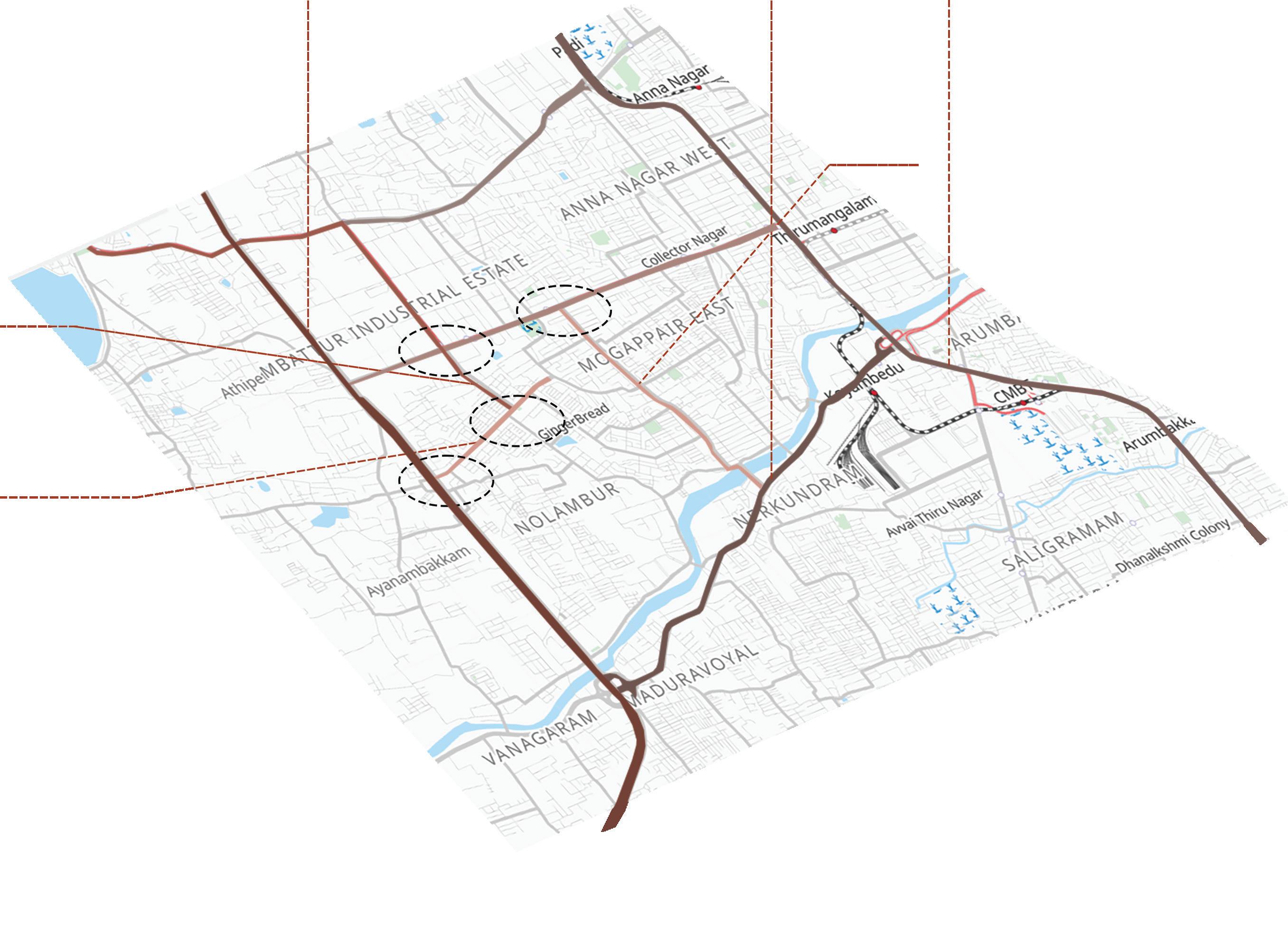 Mogappair Main Road: Major commercial Node of Mogappair. J.J.Nagar West Bus Depot: Forms connectivity to the other part of the Areacity. between 1st Main Road & Vellalar Street: Informal settlements. Rain water gets clogged in that area. North Eastern Mogappair: Unused industries and mixed use residential