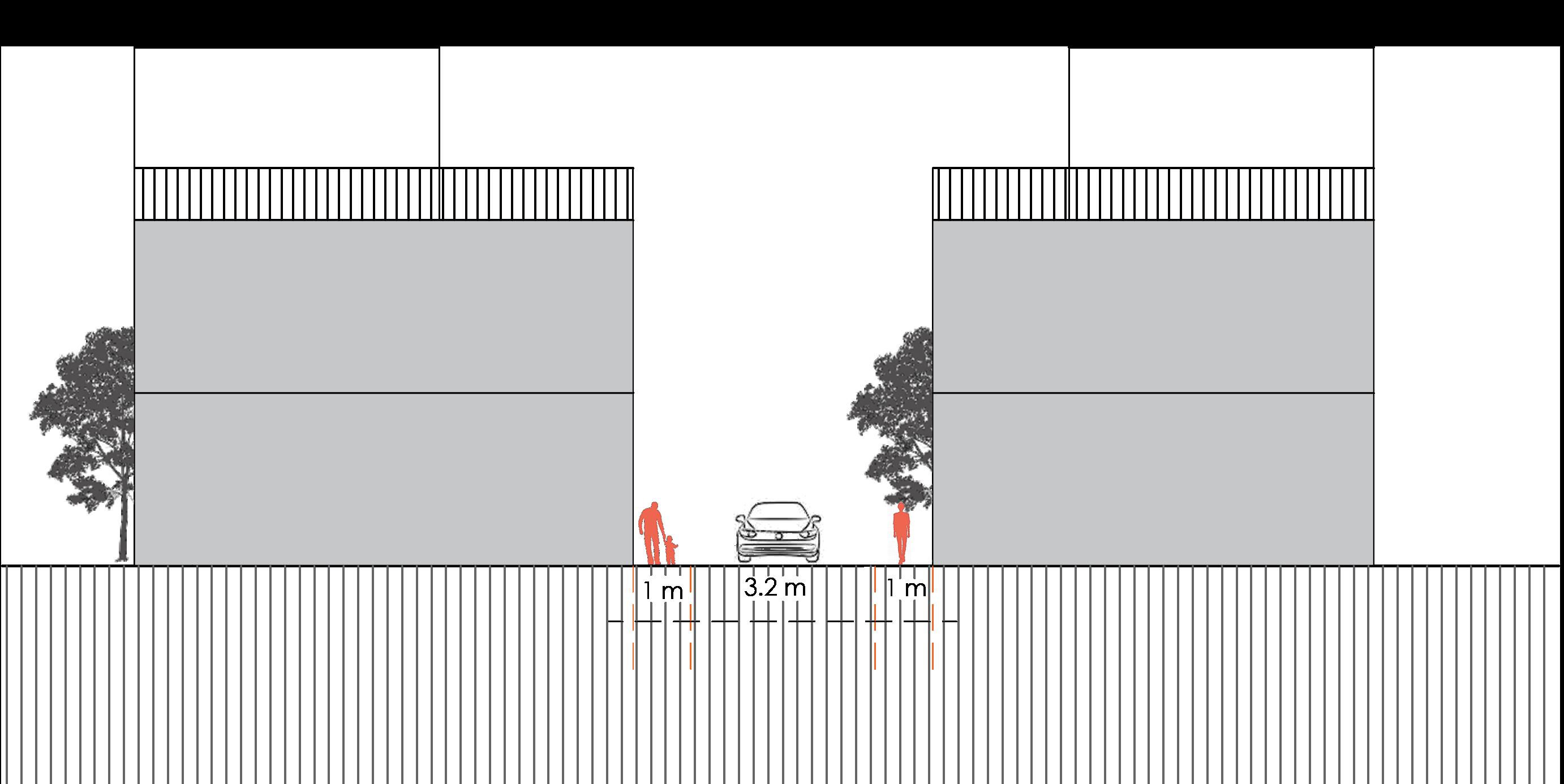 Along 3.2 m road- The road is enclosed by residential buildings of 2-3 storeys with no setbacks. Ratio = 1 : 1.9 Moderate - High Enclosure