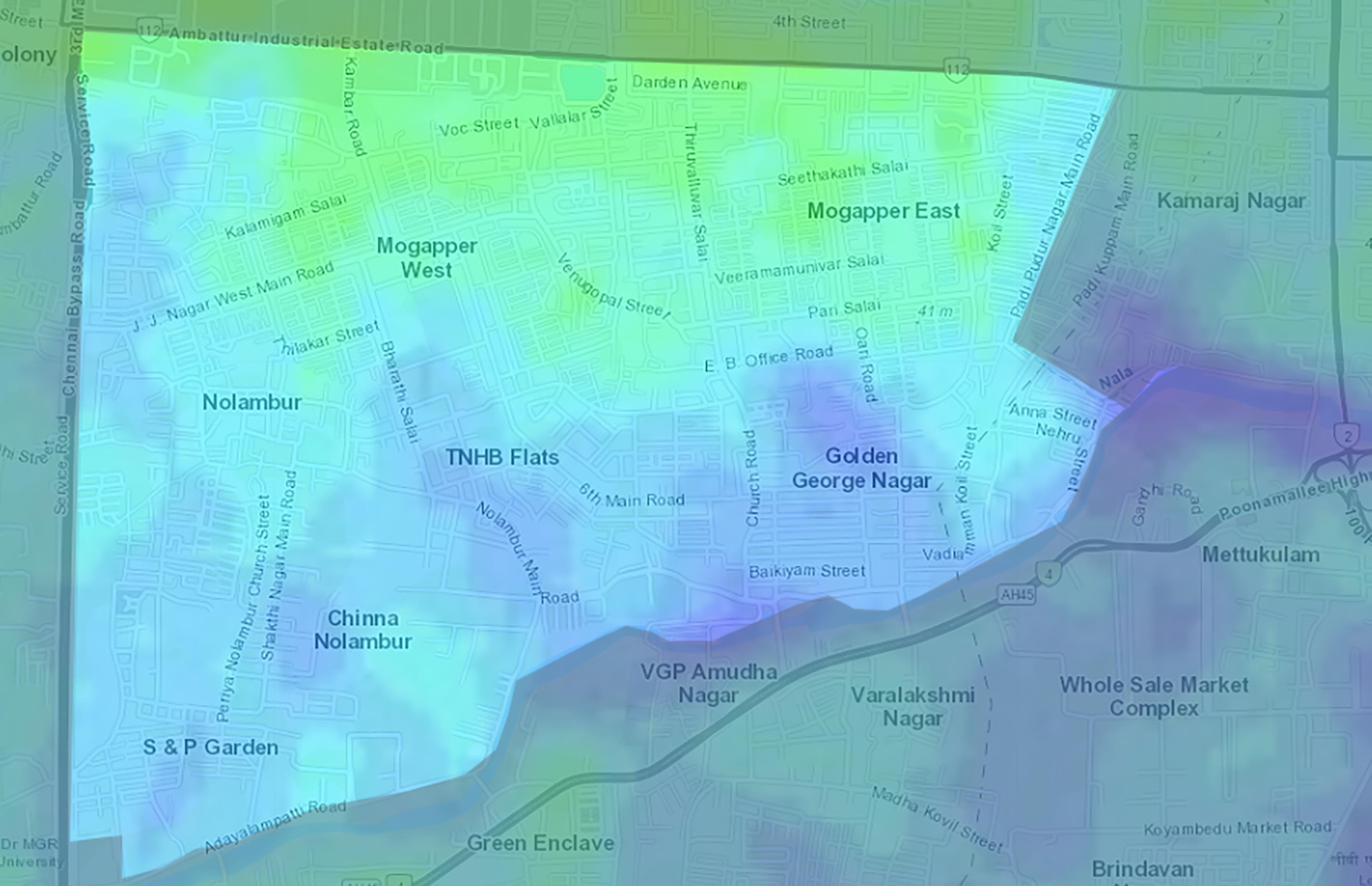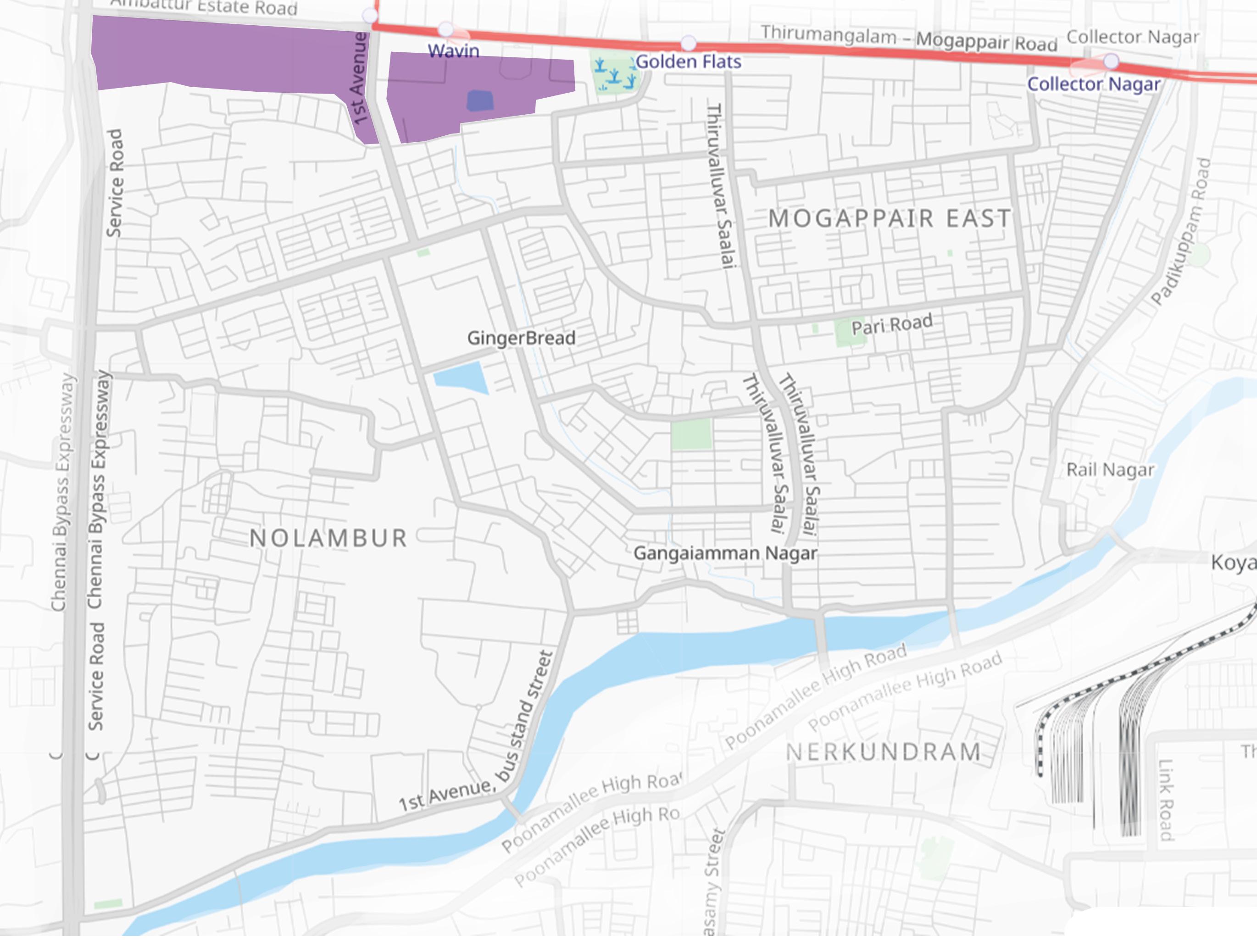 Mogappair is primarily occupied by low to high density residences. The difference in distribution can be identified based on the development and gradual evolution from Nolambur to W.Mogappair to E.Mogappair.
