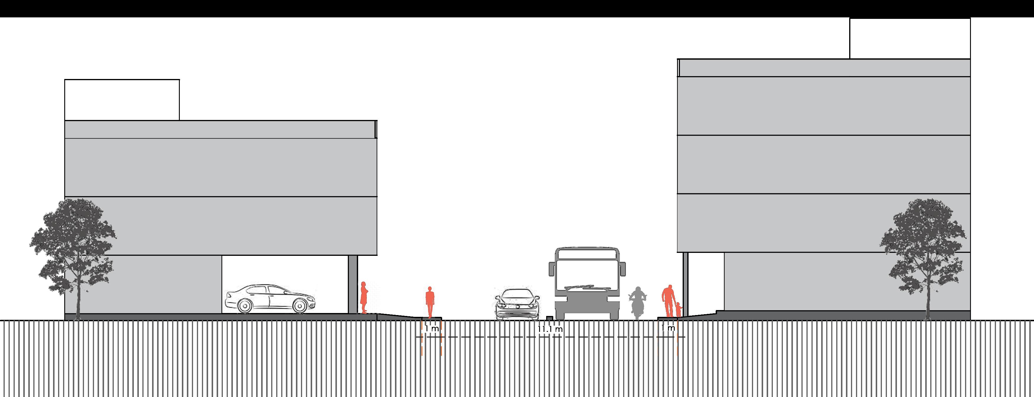 Along 11m main road- The road is enclosed by a lane of 3-4 storey buildings. Ratio = 1:1.1 Moderate Enclosure