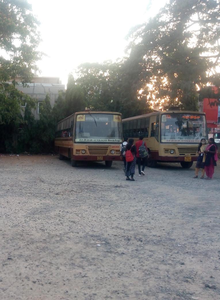 Encroachment & lack of pavement The pavements along the primary roads are encroached by local vendors and the commercial builds. In certain parts, no sidewalks are provided.Absenceof infrastructure in Bus depot W.Mogappair bus depot lacks basic fa cilities like toilets and drinking water facili Theties, shelter provided is not suffcient for the users who are majorly students.