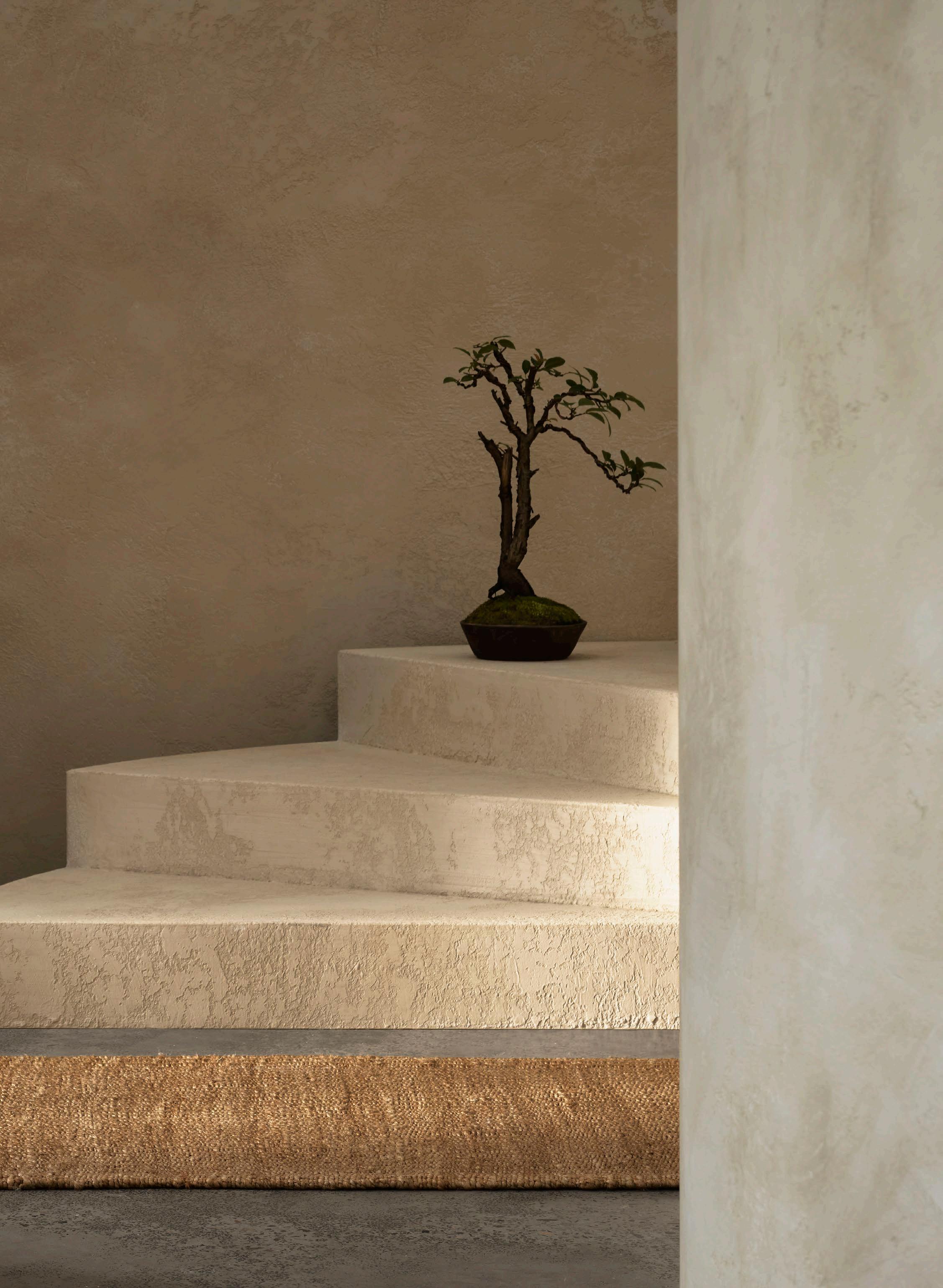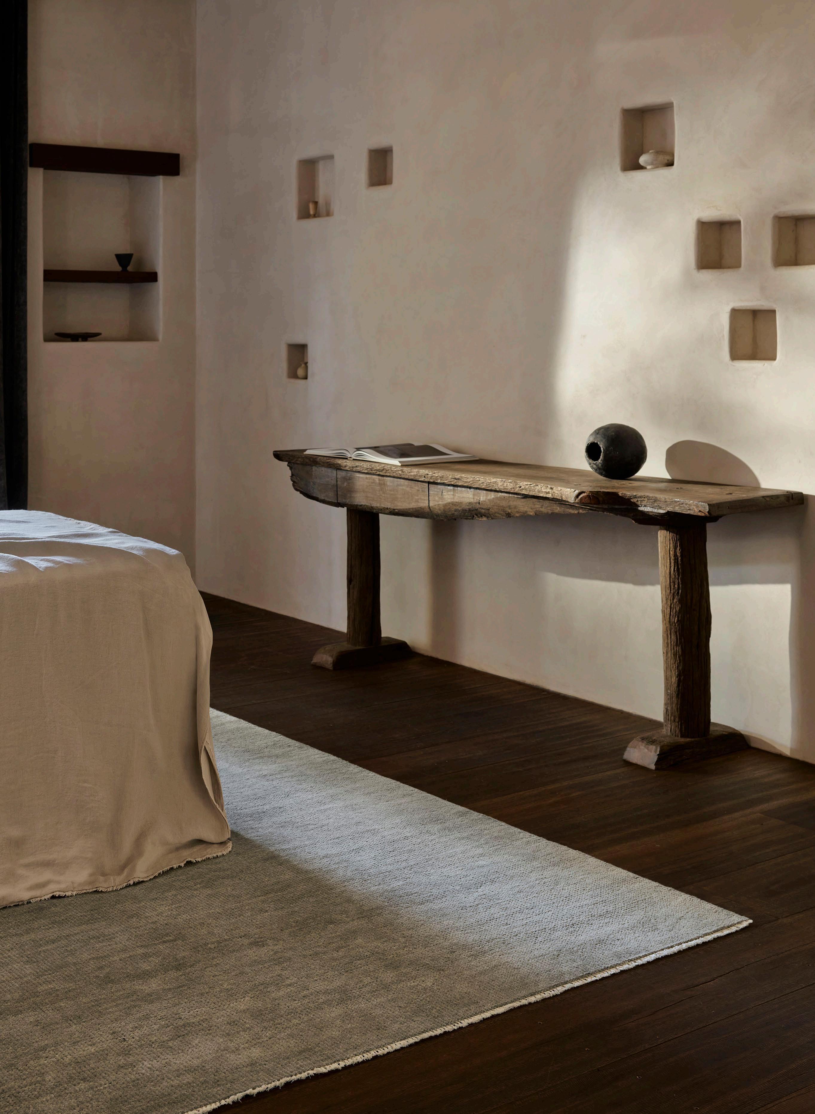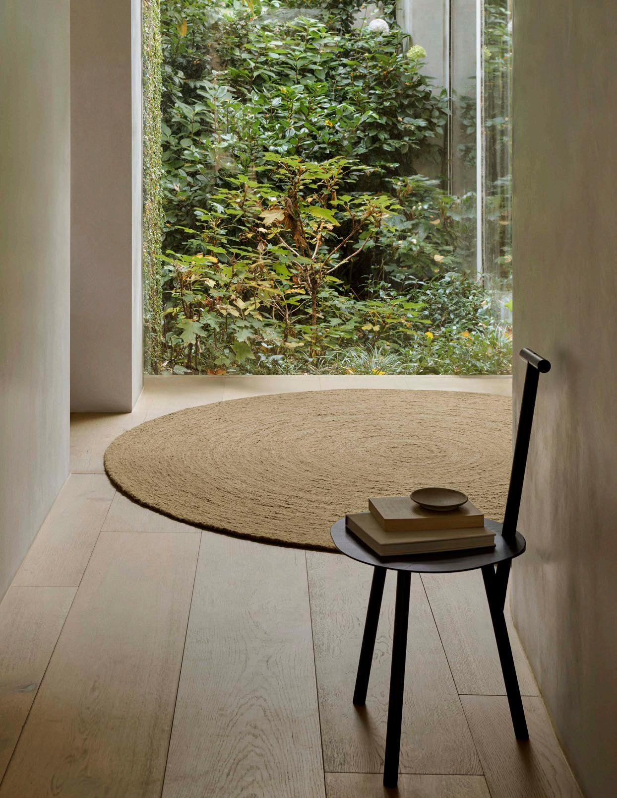 A handcrafted runner in natural fibres brings quiet refinement and textural warmth, setting a considered tone for the journey through space.