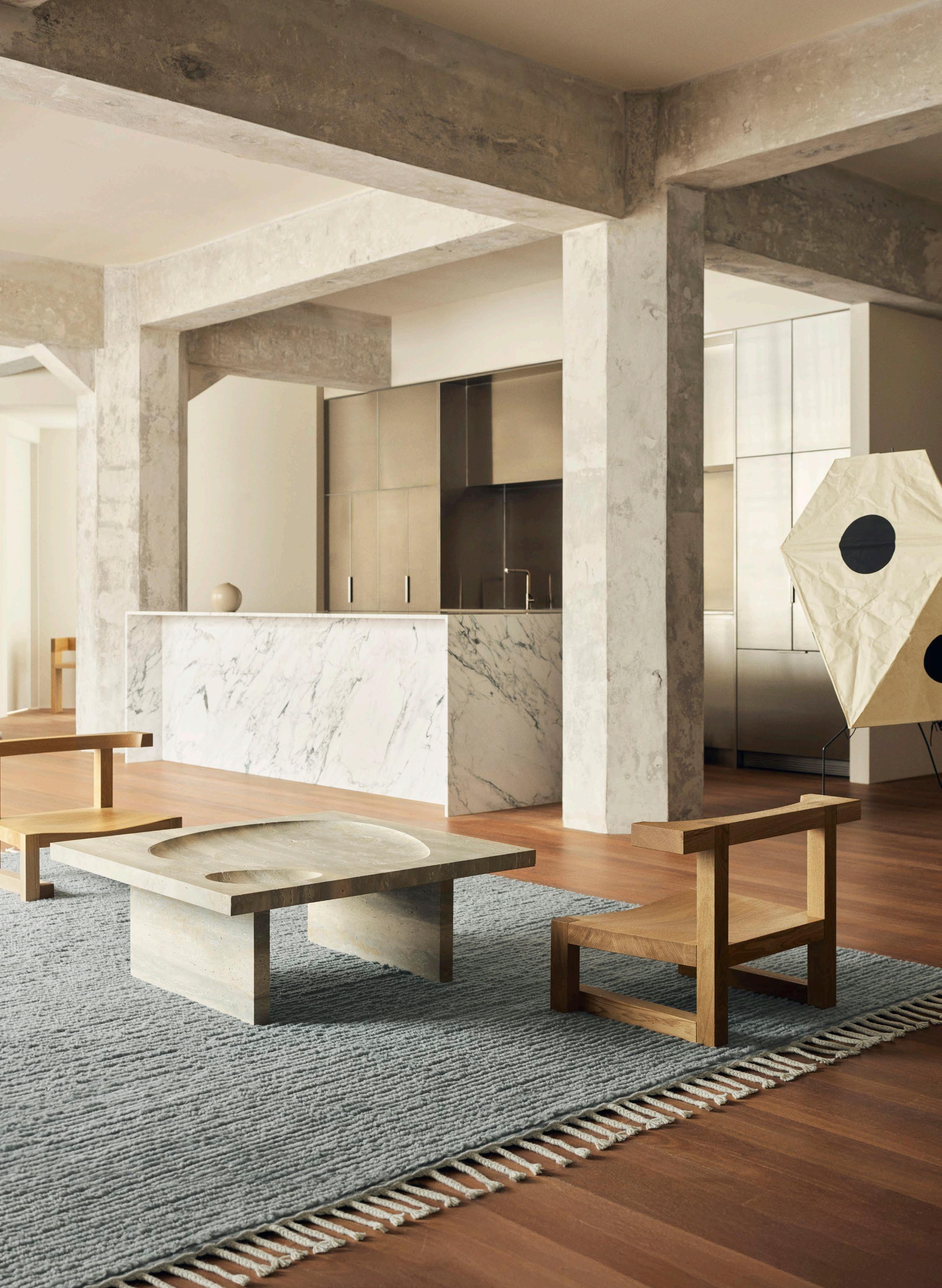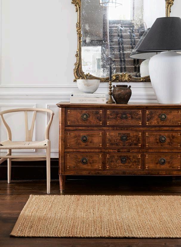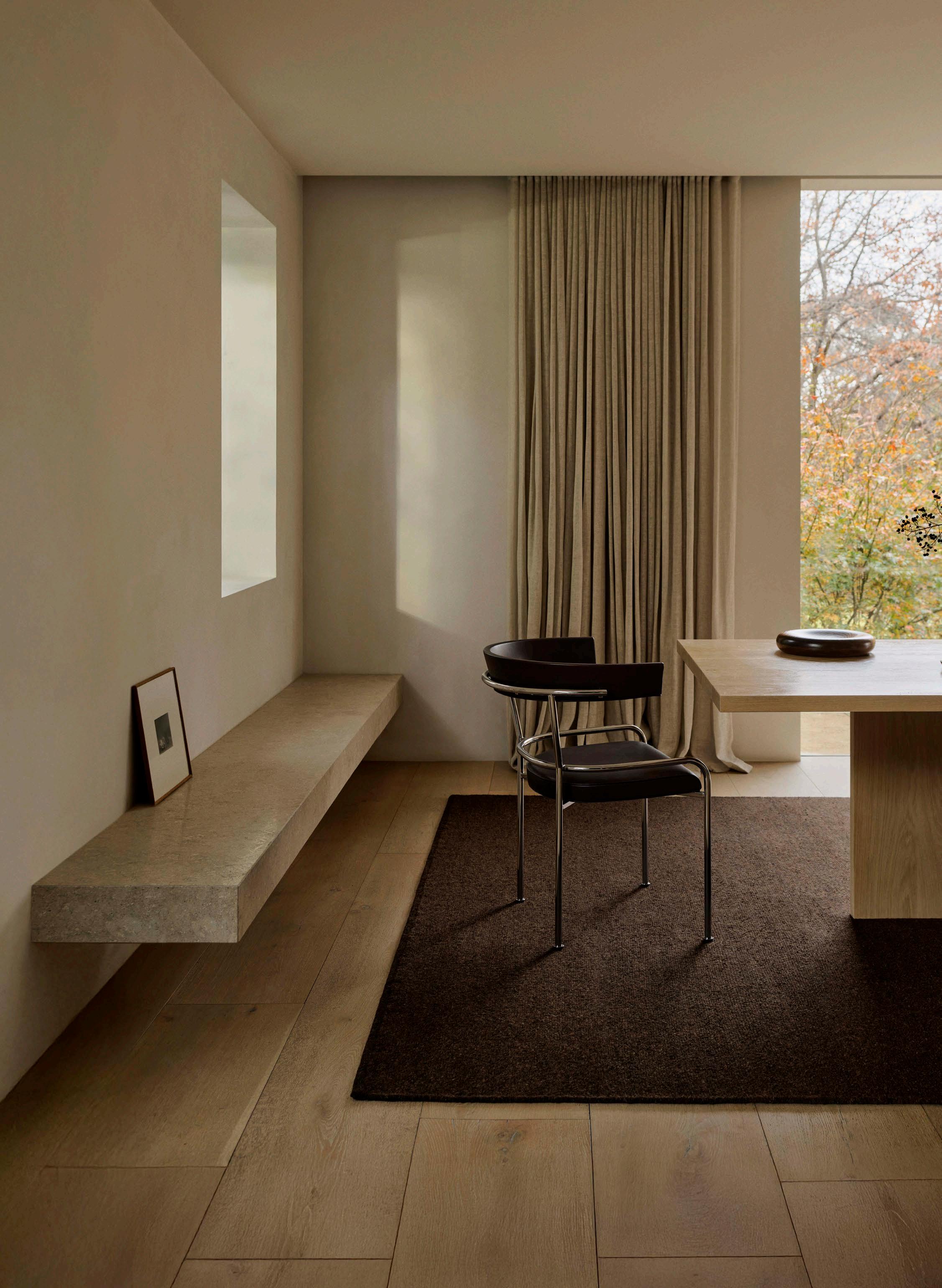 A handcrafted runner in natural fibres brings quiet refinement and textural warmth, setting a considered tone for the journey through space.