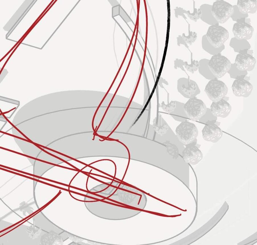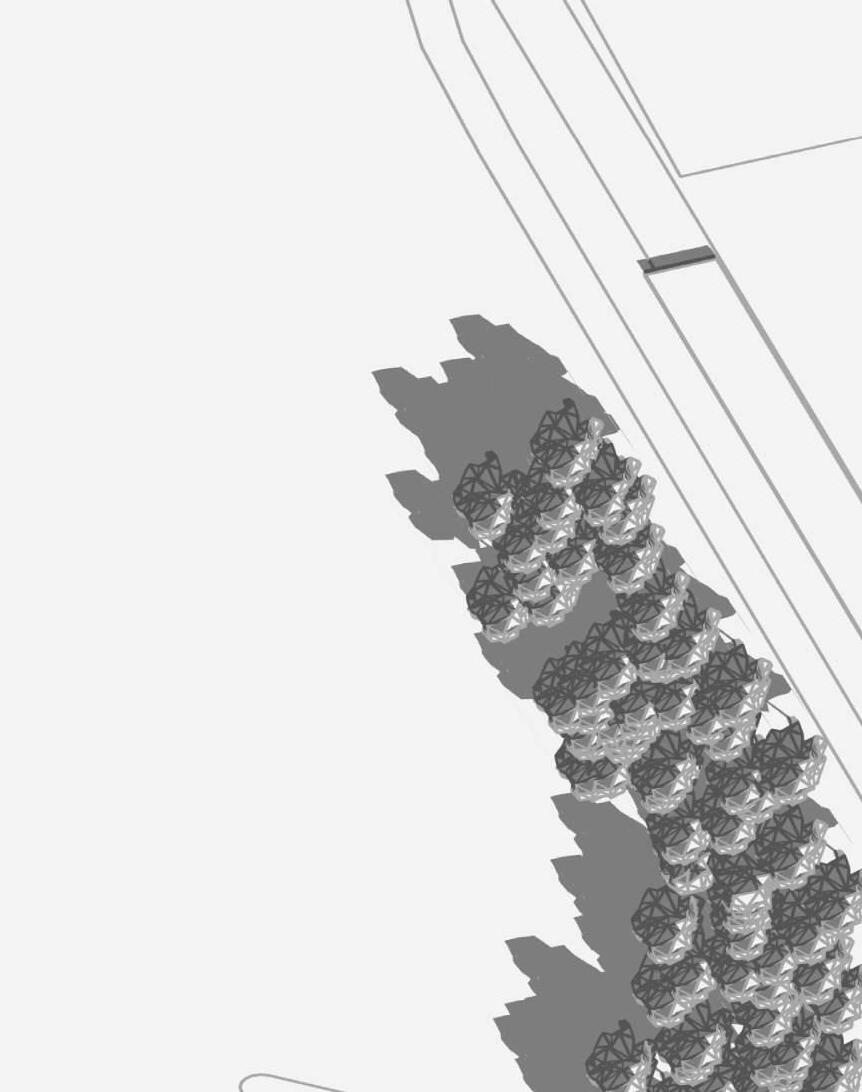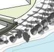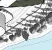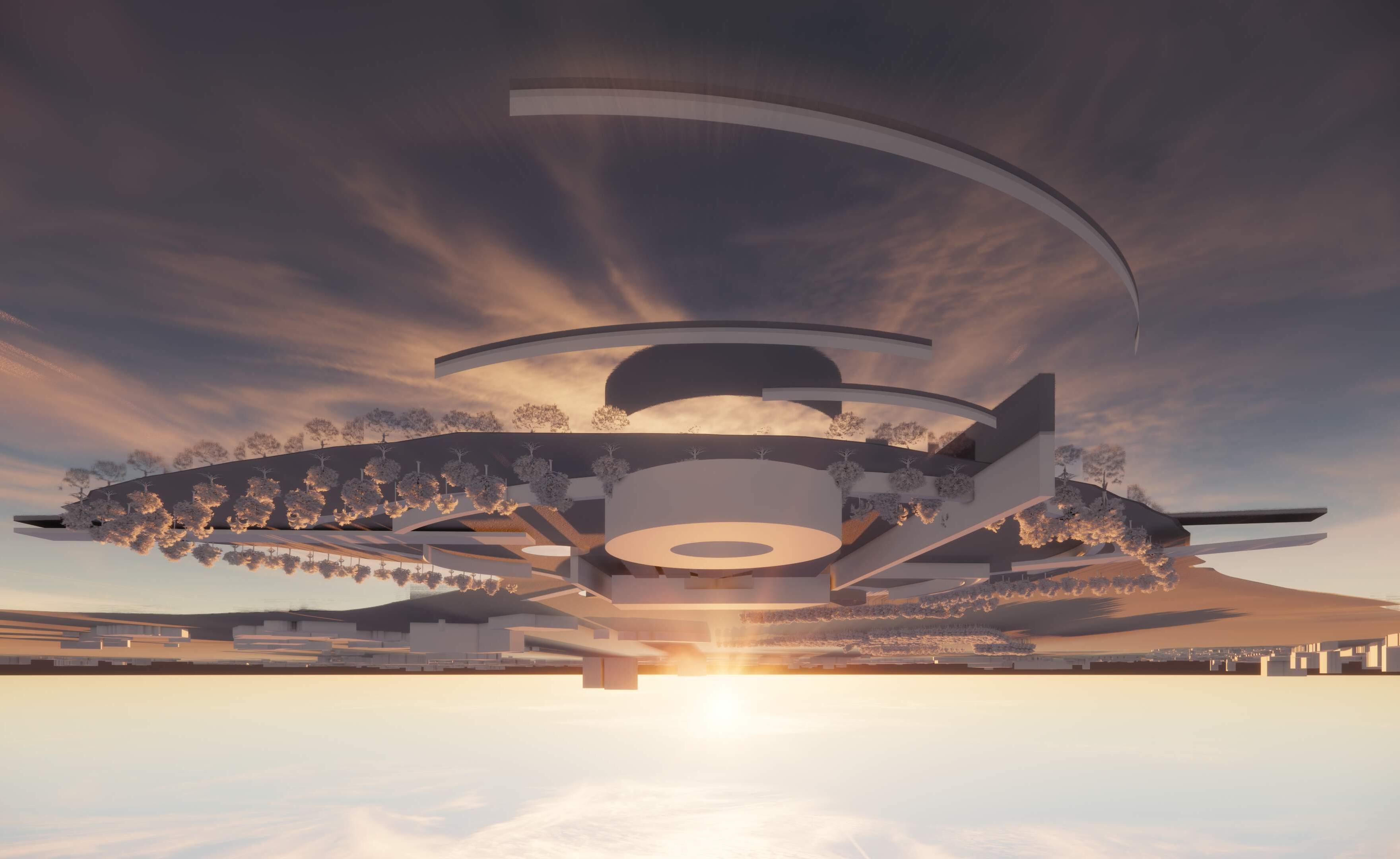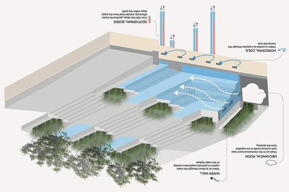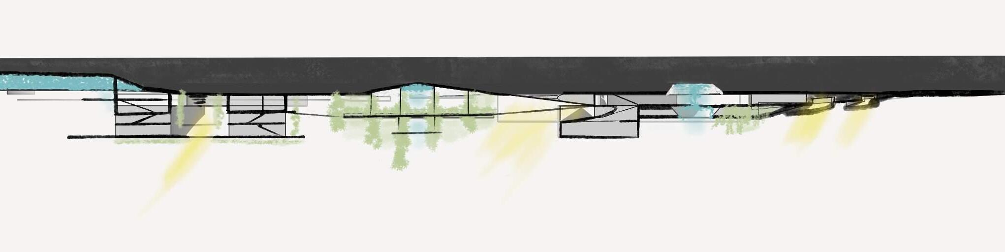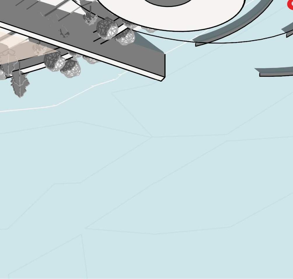 Porous massing that separates programs and create experiential space between at grade and the base. Main programming categories are connected at base. Sea of roofs connect the programming and provide shade for buildings and outdoor space. Center of scheme is an open garden and water feature area between the exhibit, research and out patient therapy. In patient therapy is separated by a continuous path of water and green wall, creating a moat barrier.