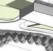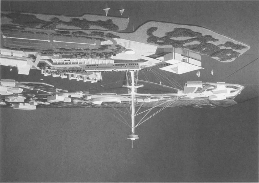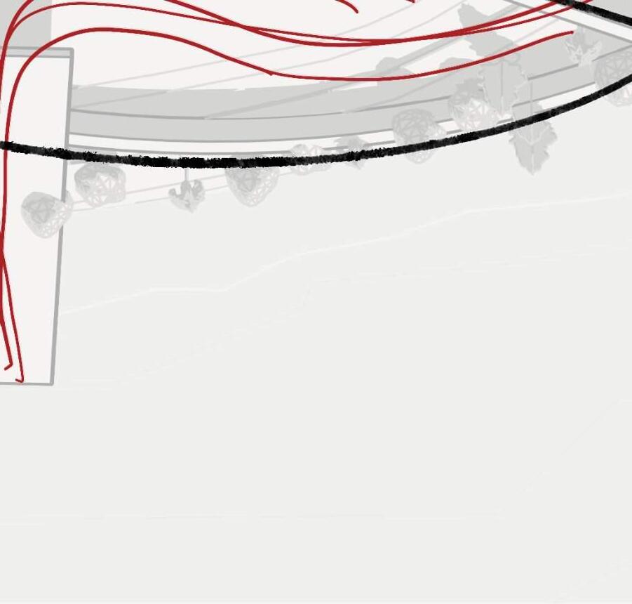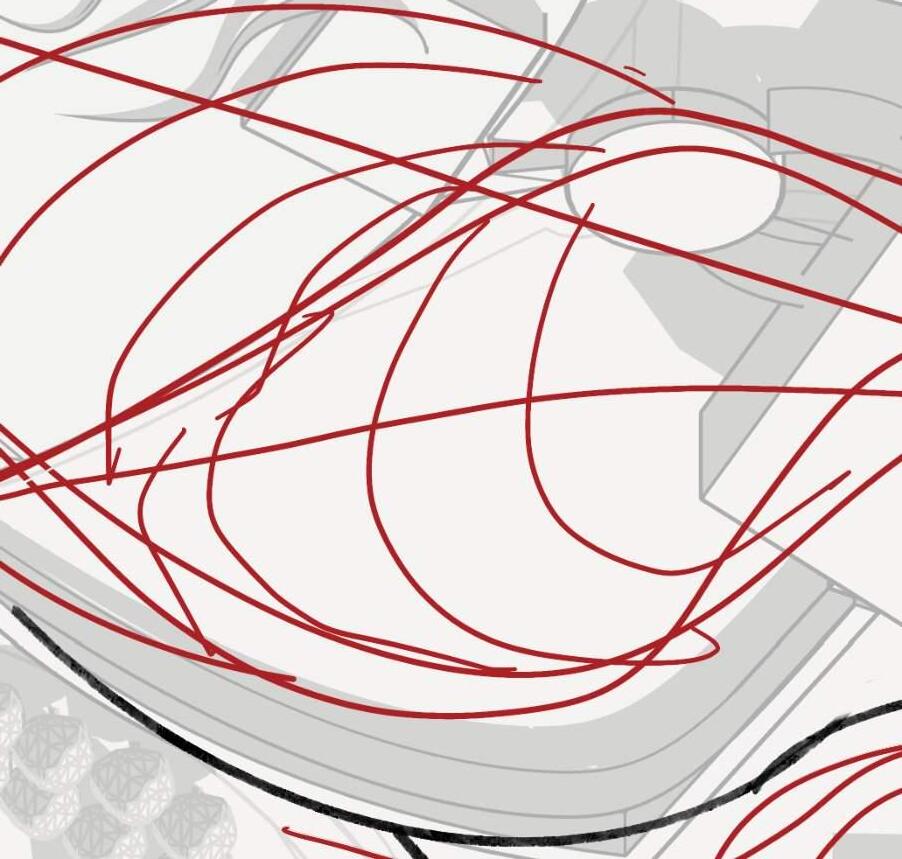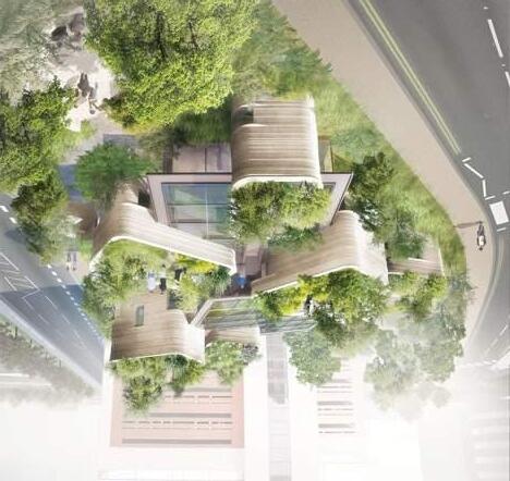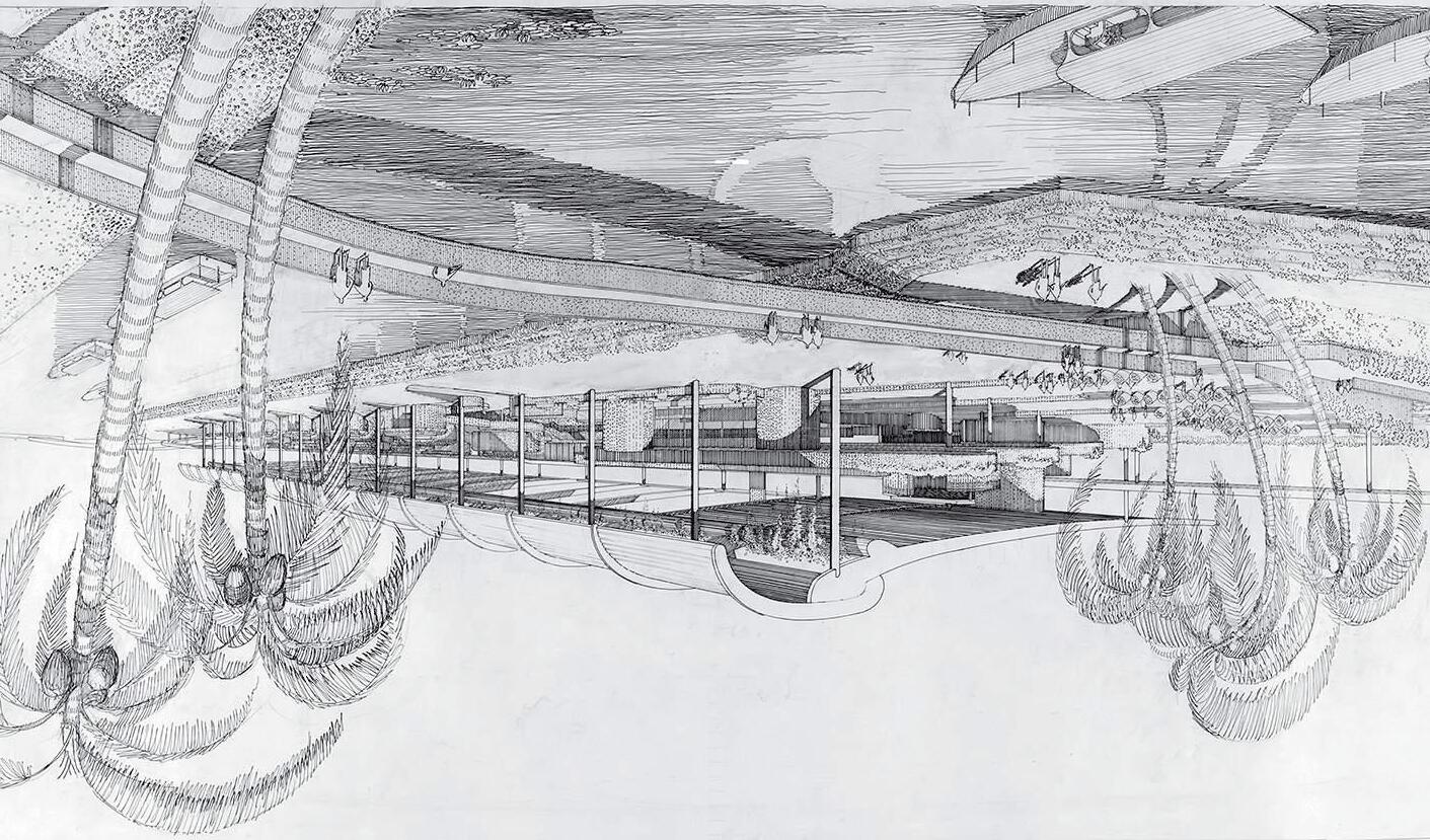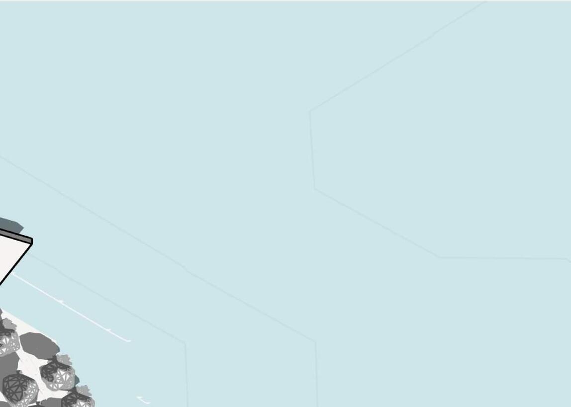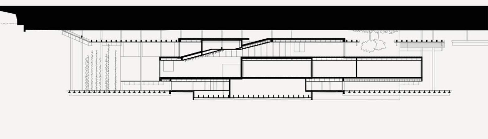 Porous massing that separates programs and create experiential space between at grade and the base. Main programming categories are connected at base. Sea of roofs connect the programming and provide shade for buildings and outdoor space. Center of scheme is an open garden and water feature area between the exhibit, research and out patient therapy. In patient therapy is separated by a continuous path of water and green wall, creating a moat barrier.