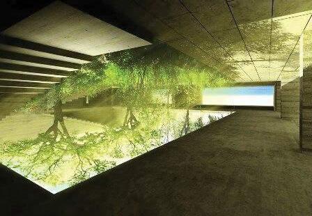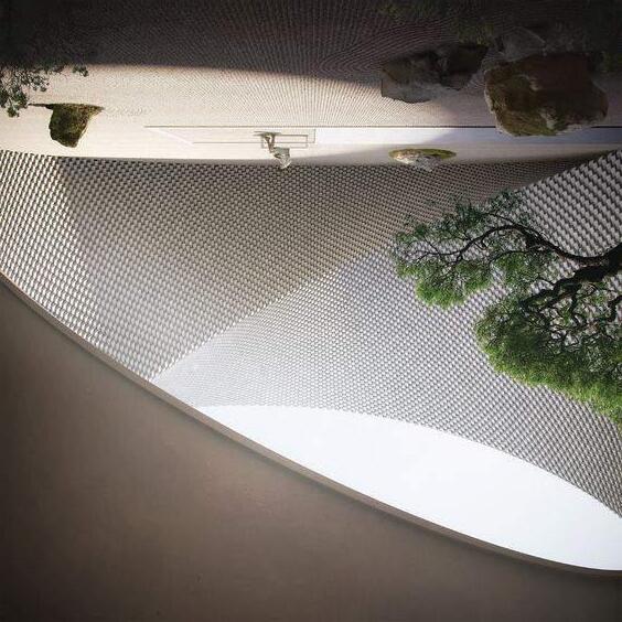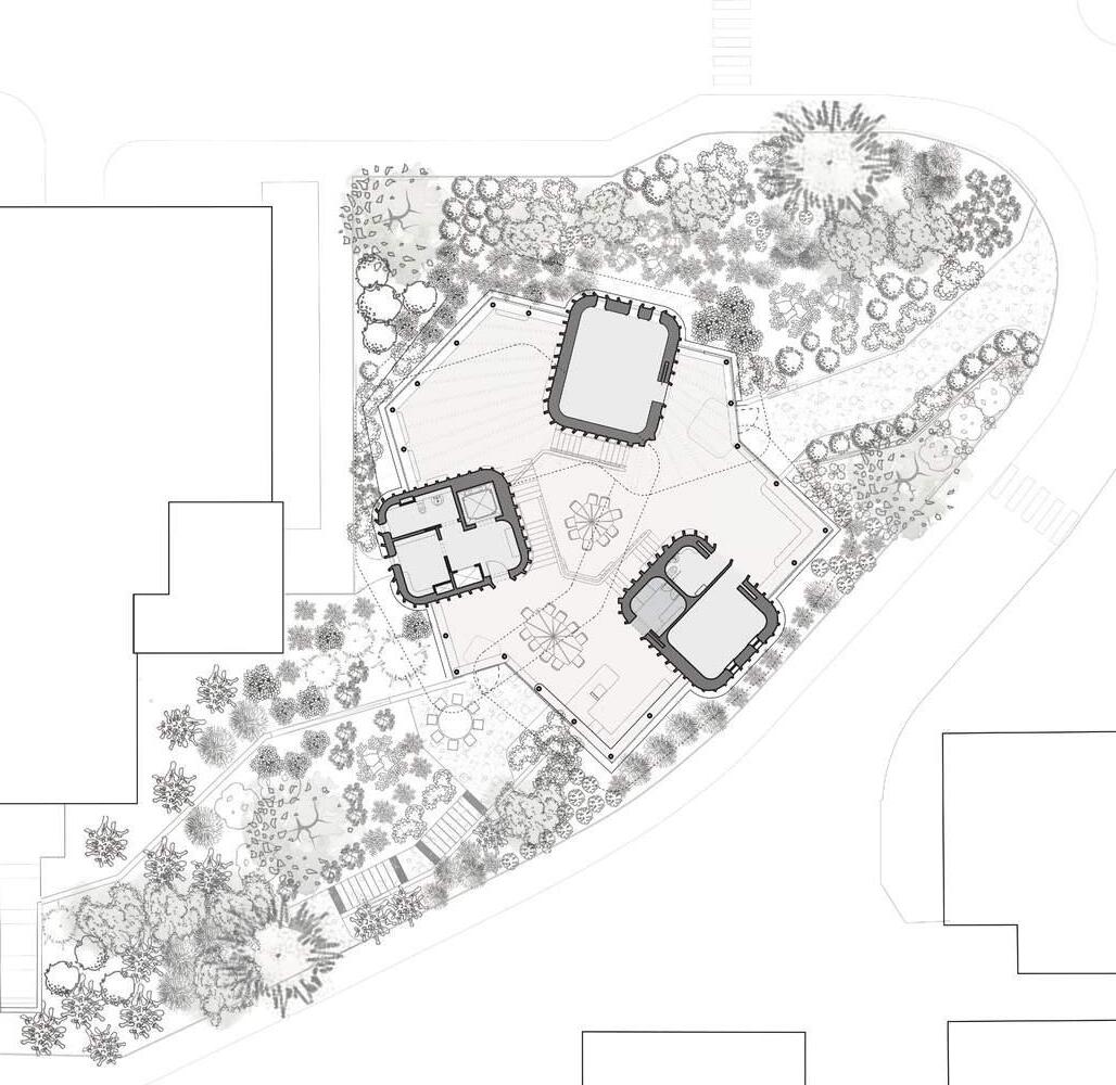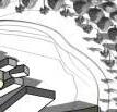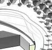 Organized around a central courtyard and radially organized along edge of site. Exhibit program creates the entrance as a bridge and transition point below. Cascaded landscape paths create a green border between the private and public areas. Ponds of water create thresholds to site destinations