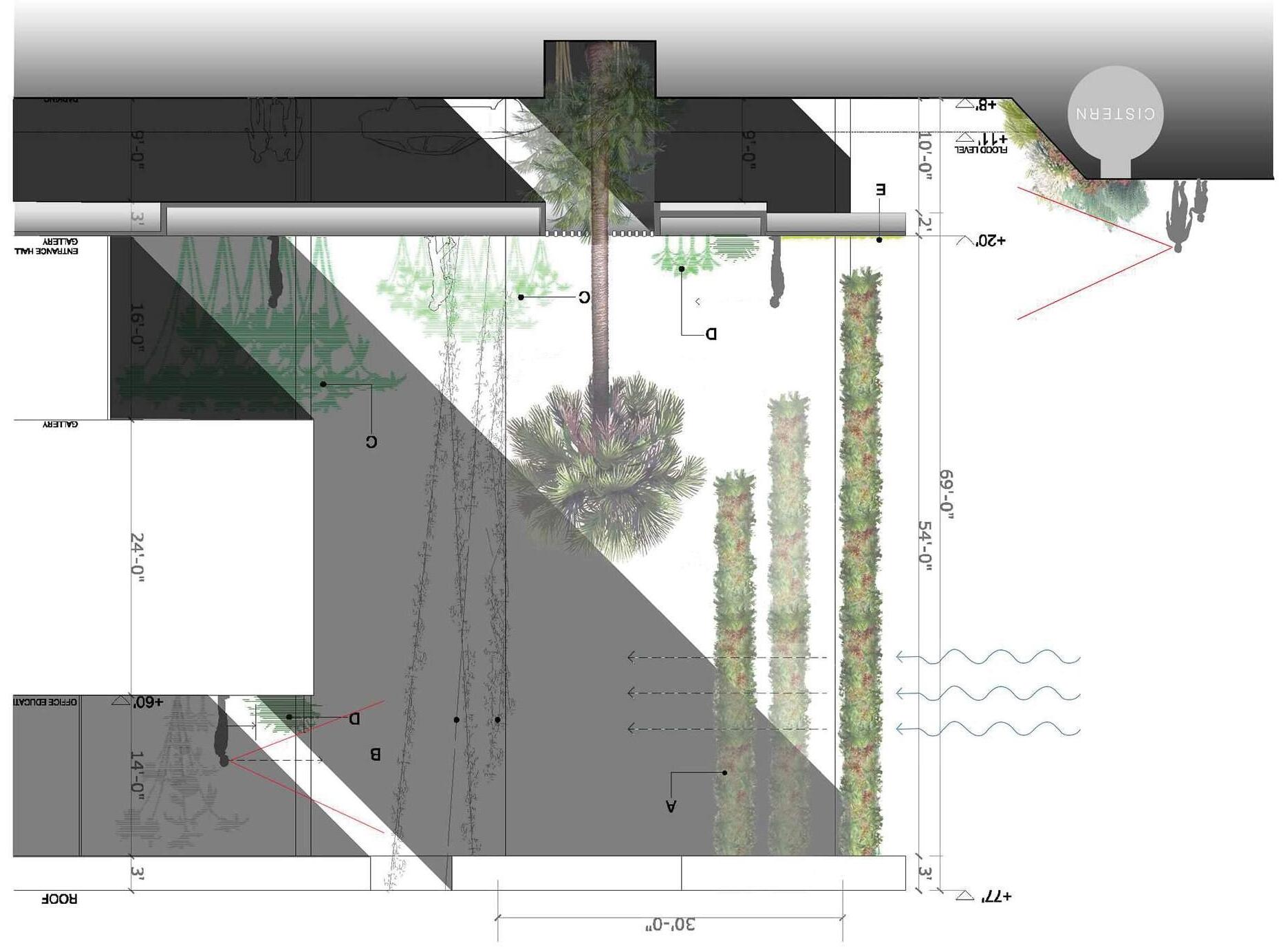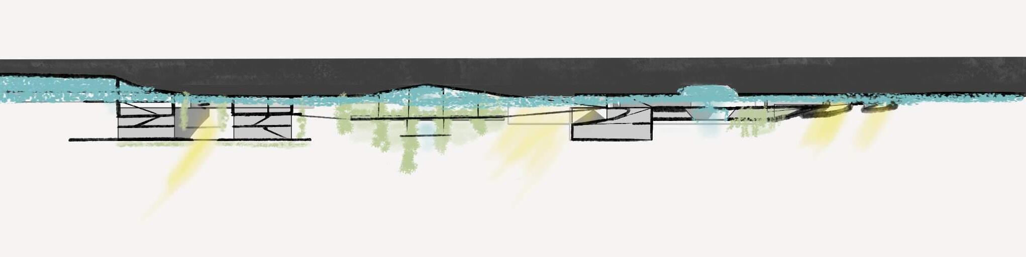 At entry you transition into the campus through a double story water fall into the exhibit space. Research is the pivot point of the site adjacent to the center, having connections to each of the programs. An east/west and north south axis is created by outdoor amenity space. Small ponds and streams are weaved through the site connecting at the center through waterfalls and tunnels.