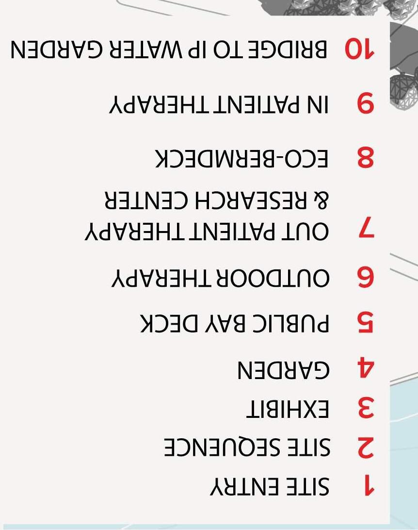 SENSORY THEORY 39 SITE DESIGN SKETCH IN PATIENT THERAPY OUT PATIENT THERAPY & RESEARCH CENTER ECO-BERMDECK PUBLIC BAY DECK GARDEN OUTDOOR THERAPY EXHIBIT SITE ENTRY SITE SEQUENCE BRIDGE TO IP WATER GARDEN 1 1 2 3 6 7 8 9 10 4 5 2 3 4 5 6 7 8 9 10