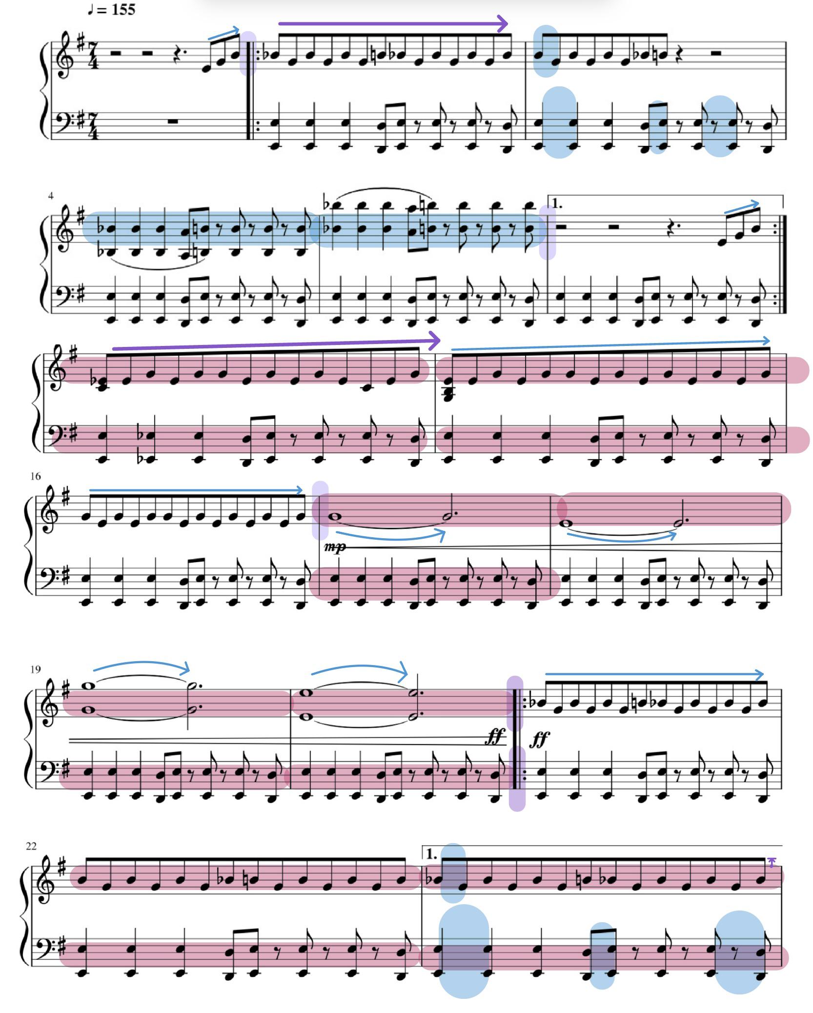 - The appearance of blue notes (note 16 to 19) corresponds to the 'flat, curved notes' (guitar discontinuation), representing the Crystal Bridges museum and the guitar-played notes symbolize nature. This interplay establishes contrast between the natural and constructed environments.